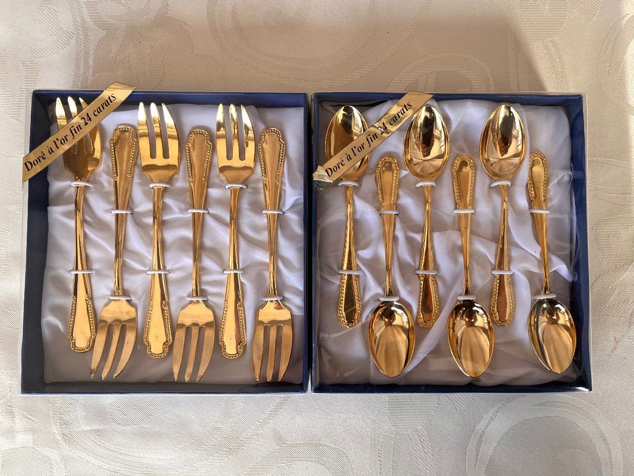 Les couverts sont à l'état neuf, protégés individuellement par des attaches dans deux boites avec intérieur en tissu blanc satiné et avec leurs rubans de garantie "Doré à l'or fin 24 carats"