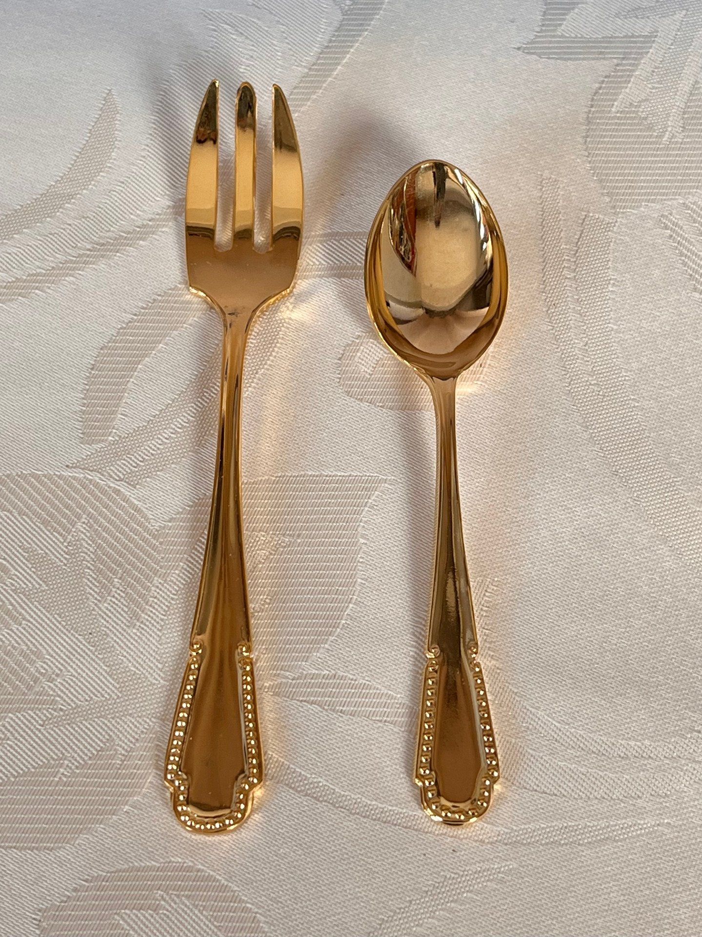 Alerte pépite pour vos réceptions ! 🌟 Lot de 12 couverts à dessert, 6 fourchettes et 6 petites cuillères, dorés à l'or fin 24 carats. Ils sont parfaits pour apporter une brillance incomparable à votre décoration de table. Voir description