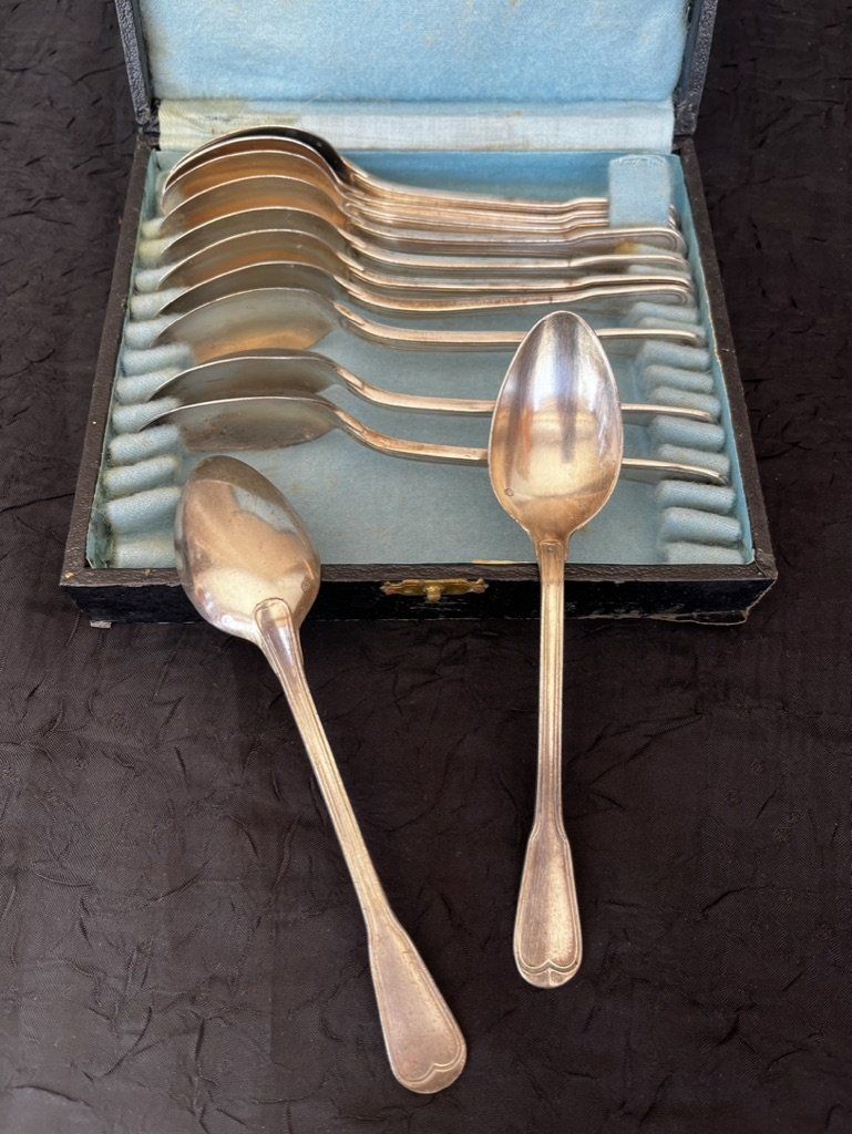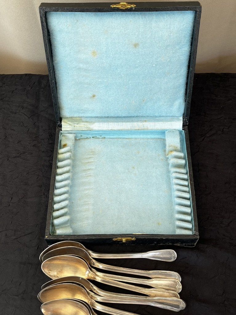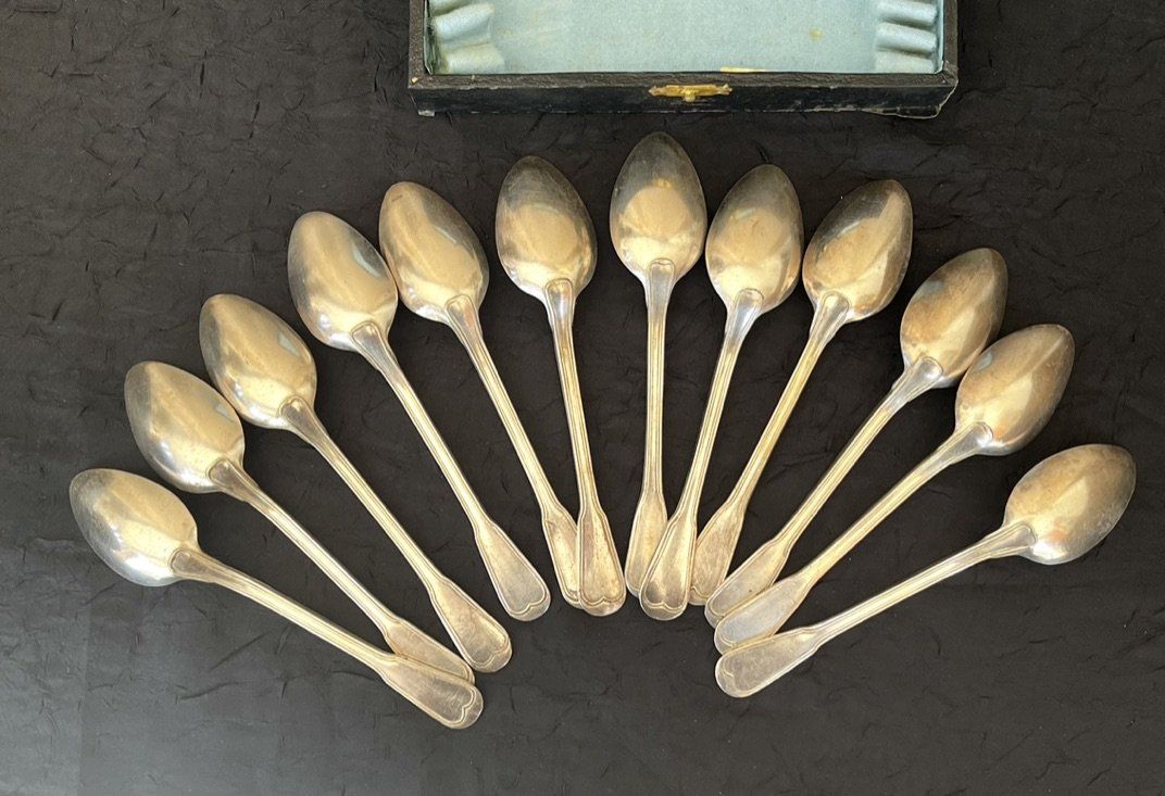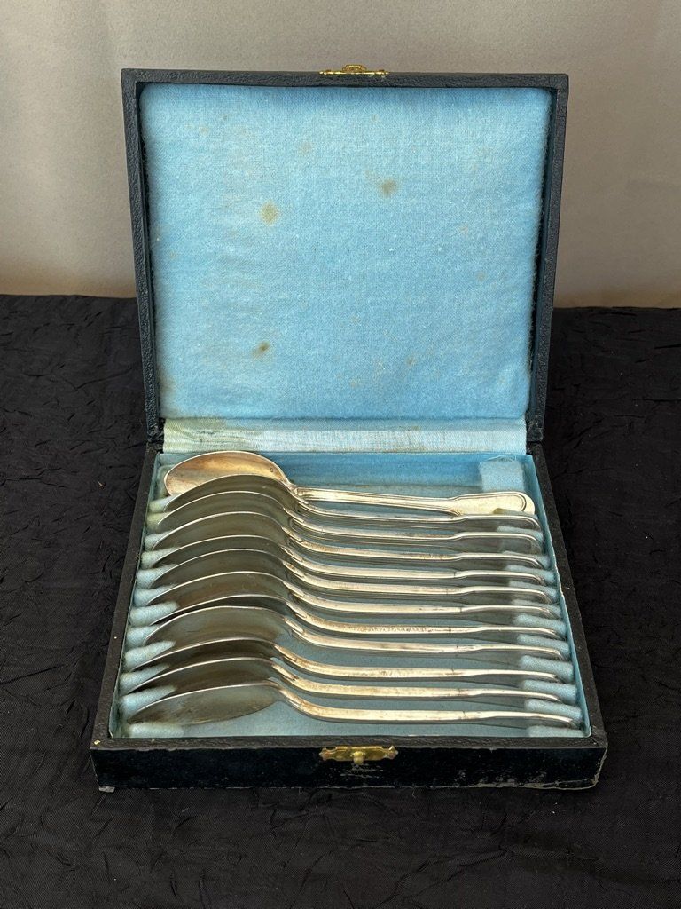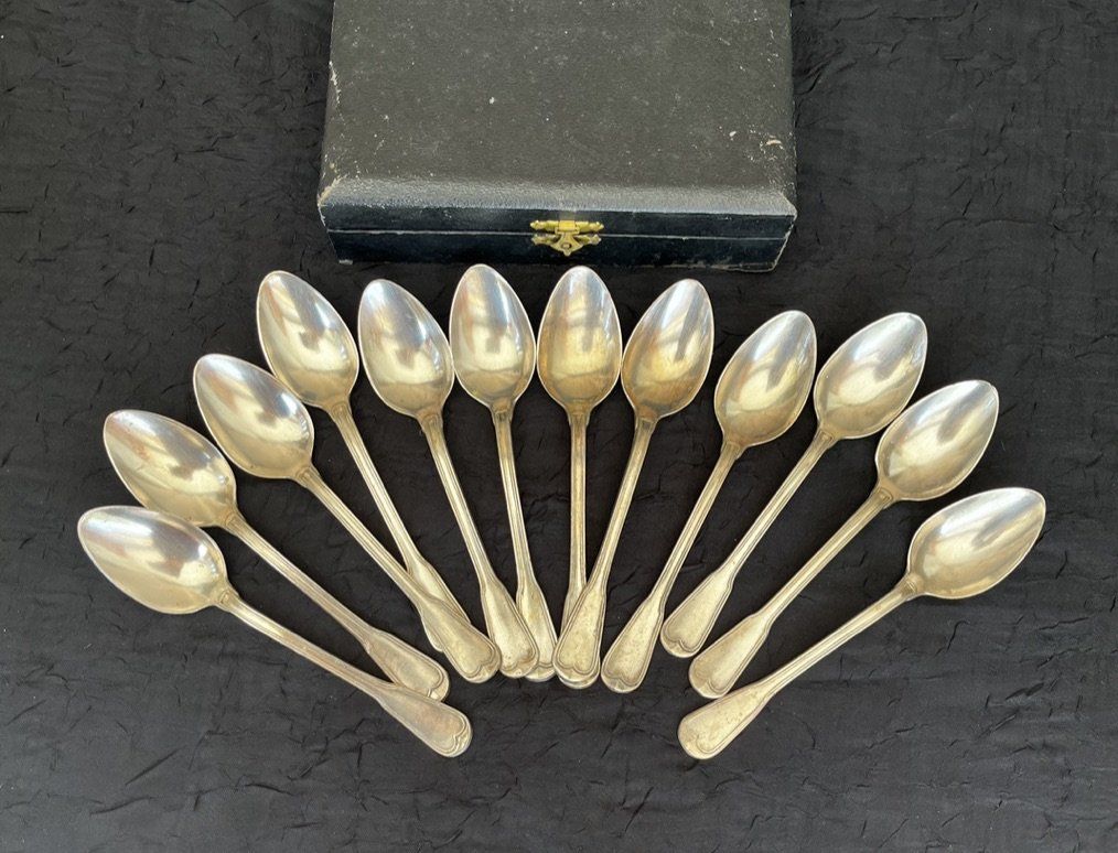 12 petites cuillères à dessert poinçonnées, en métal argenté dans leur écrin