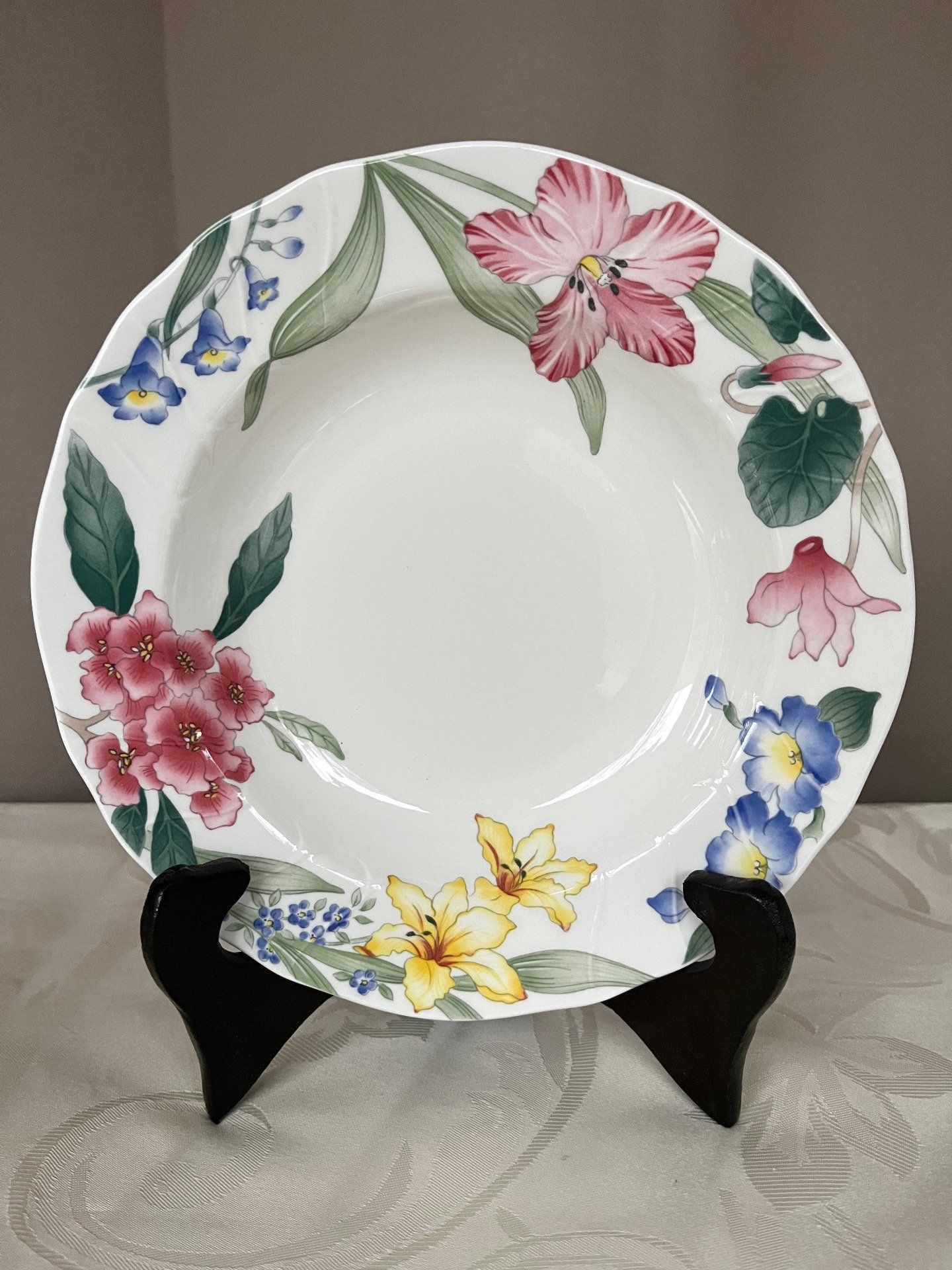 Paire d'assiettes creuses Villeroy & Boch modèle Flora Bella en vitro-porcelaine produite entre 1990-1994. Parfait état, bords festonnés et décor floral printanier. Idéal pour compléter un service ou dépareiller avec élégance. Voir description