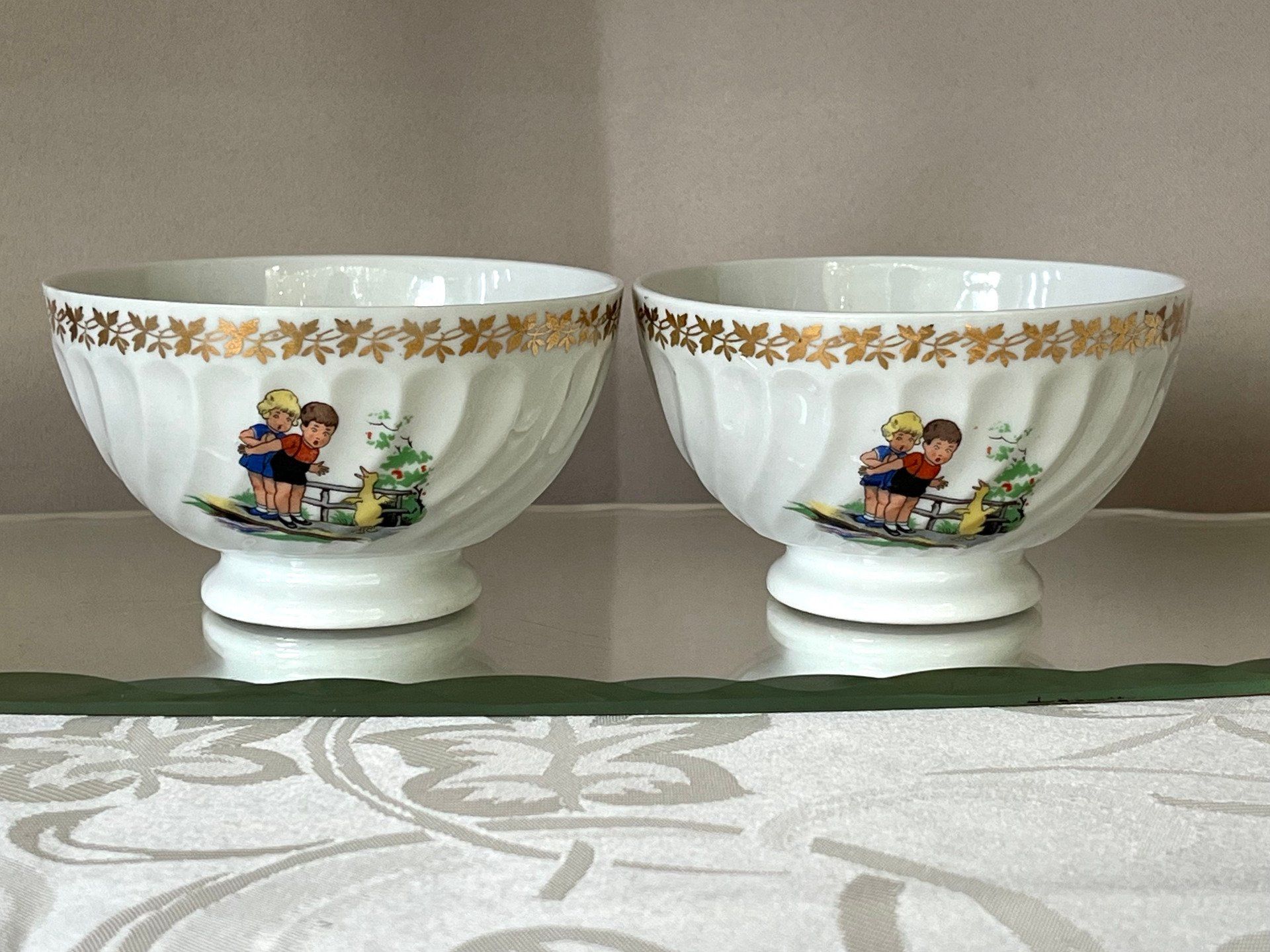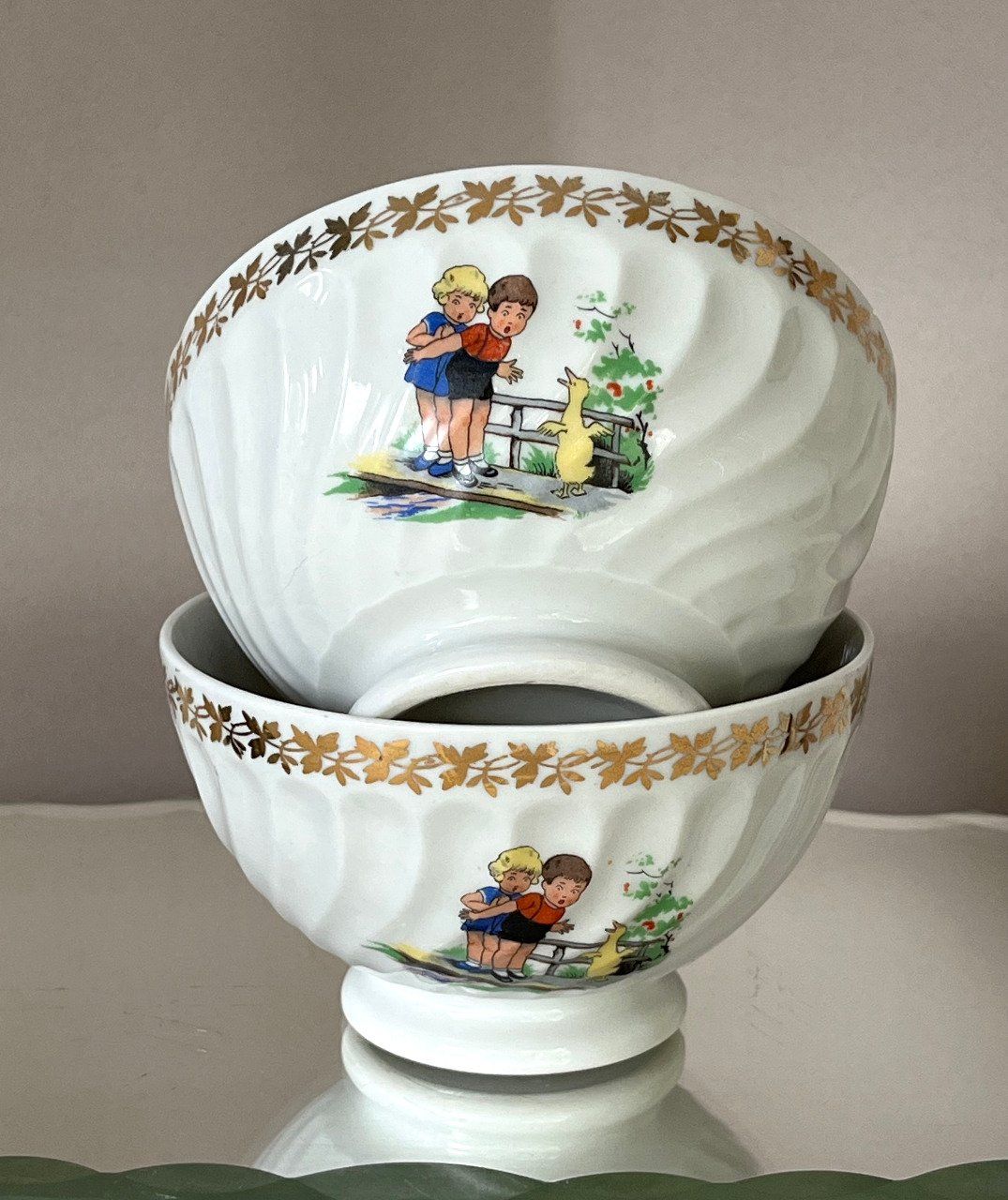 Charmante paire de petits bols anciens en porcelaine, décorés d’une scène d’enfants au style proche de Germaine Bouret, avec frise dorée sur le bord. Ensemble délicat et décoratif, idéal collection ou vaisselle ancienne. Voir description détaillée.