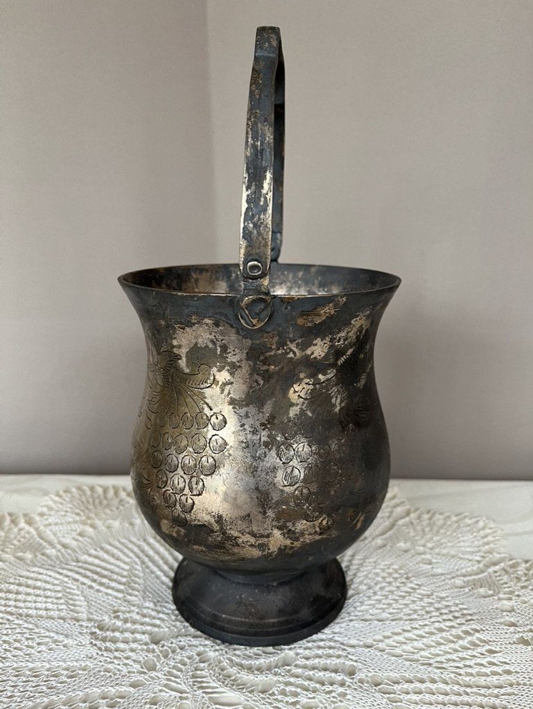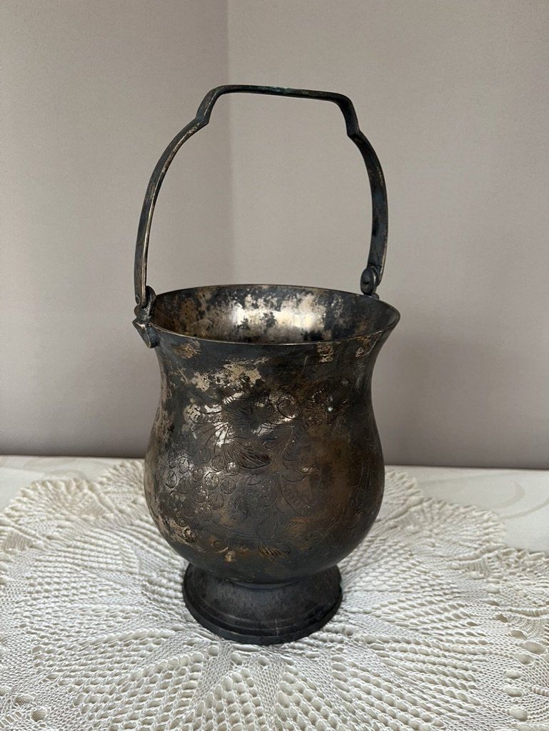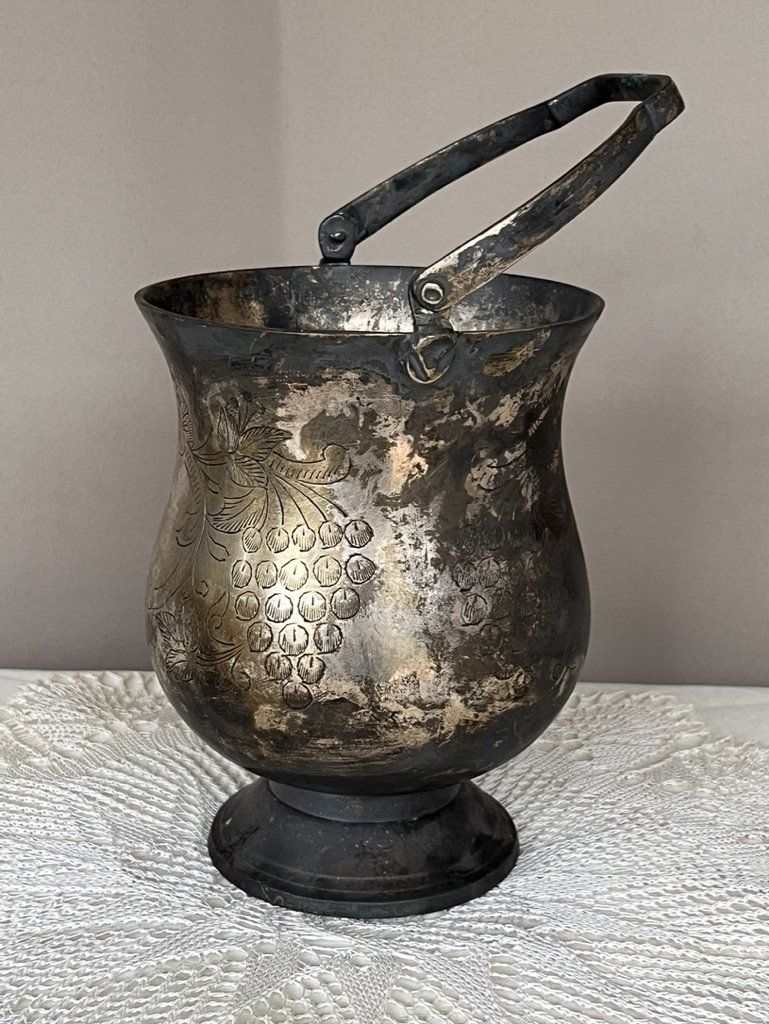 Élégant seau ancien en métal argenté richement orné de motifs de feuillages et de grappes de raisin pour une décoration de table raffinée. Pièce du début du XX° siècle a un charme vintage indéniable pour amateurs d'objets de caractère. Voir descriptif