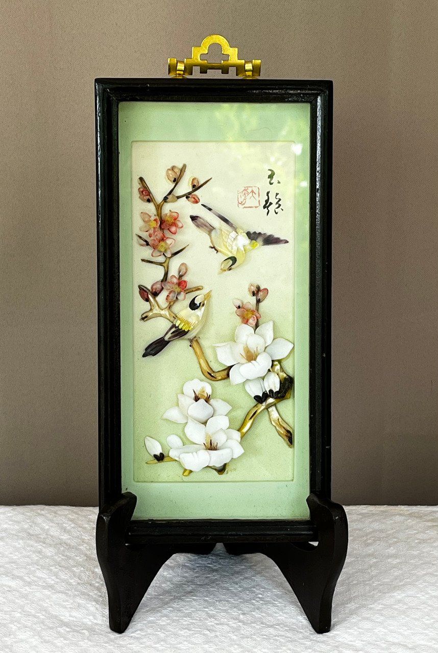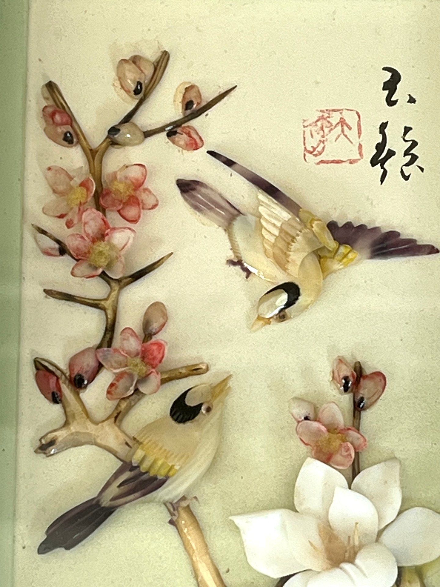 Ce diorama captivant offre une scène printanière d'une grande finesse. Le relief est créé par l'assemblage de morceaux de coquillages naturels, jouant avec les reflets irisés pour donner vie aux oiseaux et aux fleurs (cerisiers roses et fleurs blanches). Une calligraphie chinoise élégante complète la composition à l'intérieur.