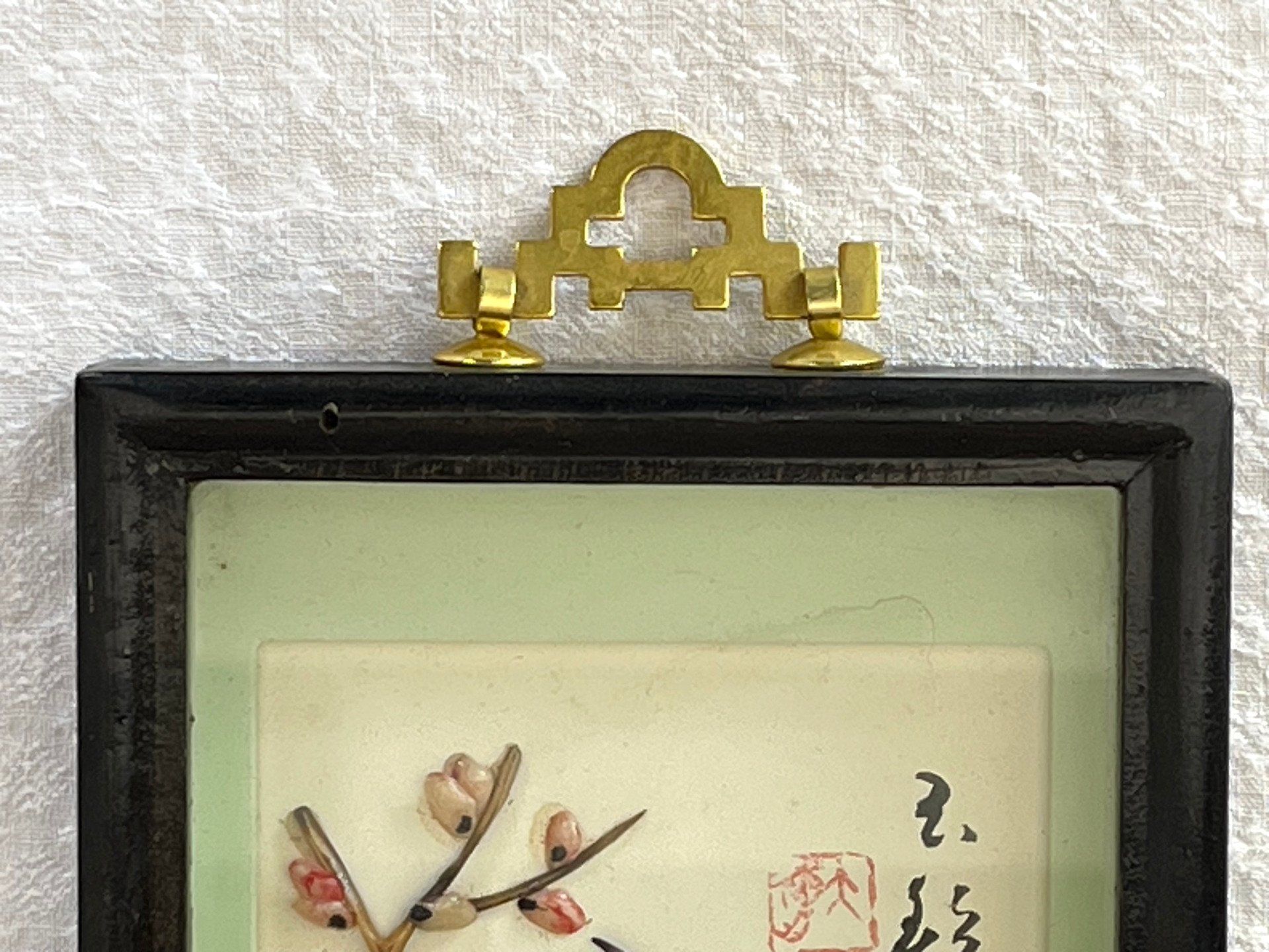 Charmant petit tableau chinois vintage en relief représentant une scène naturelle avec deux oiseaux et fleurs de cerisier. Décor minutieux réalisé en marqueterie de coquillages. Cadre en bois noir avec attache dorée. Voir description détaillée