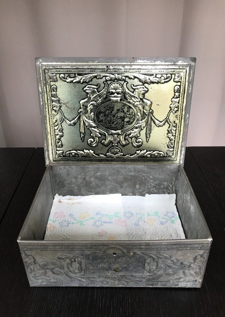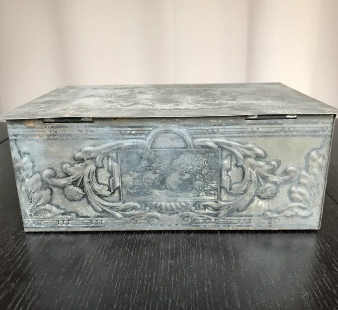 Ancienne boite à biscuits en métal ou peut être en l'étain repoussé ? Les images sont en relief, représentations avec des aigles faisant penser à Napoléon, motifs de vrilles et écussons avec nature morte de fruits. Voir + de détails dans description