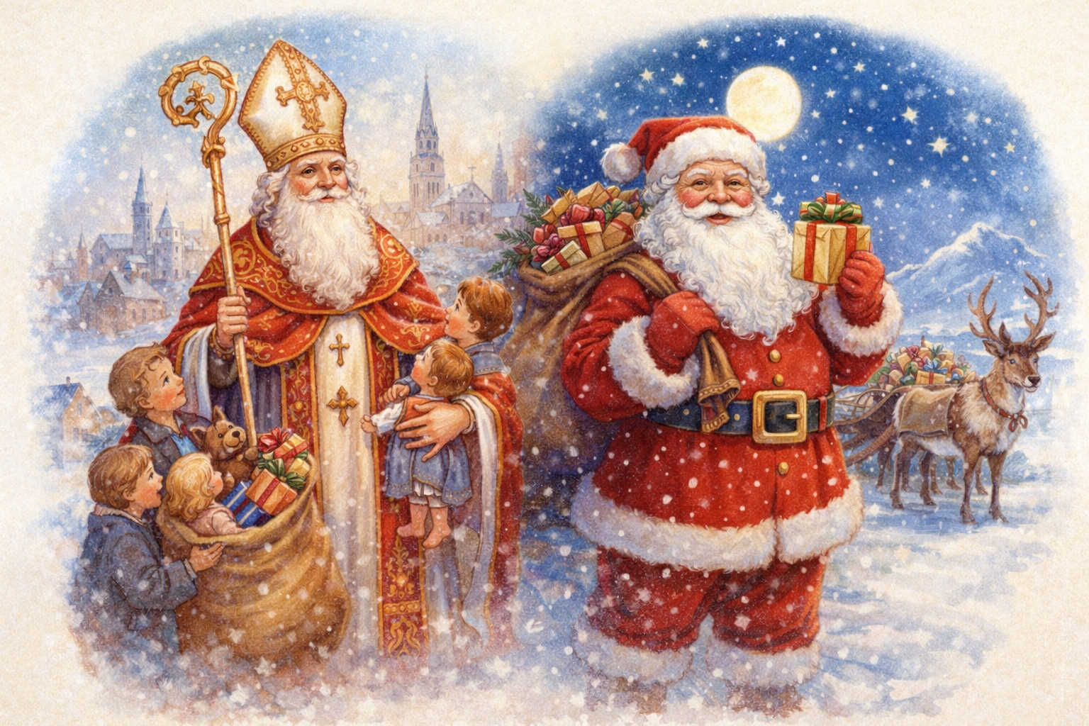 Le Père Noël trouve ses origines dans Saint Nicolas, évêque du IV° siècle, né en Asie Mineure (actuelle Turquie). Réputé pour sa grande générosité envers les enfants et les plus démunis, il devient une figure très populaire en Europe, notamment en France, en Allemagne et aux Pays-Bas, où il est appelé Sinterklaas.