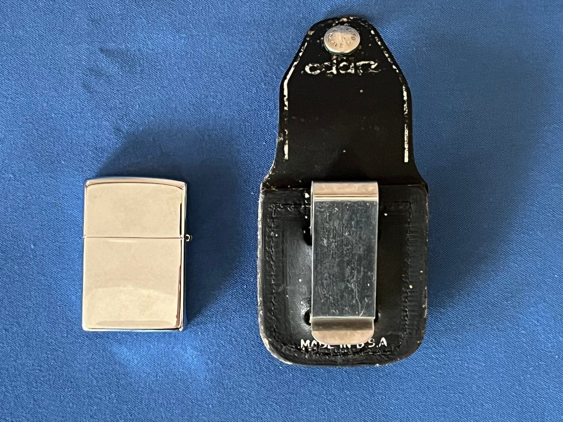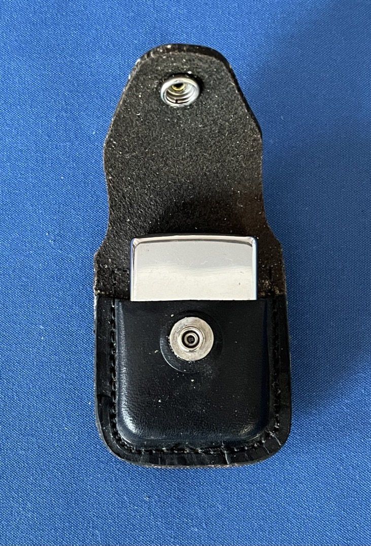 Le briquet est accompagné d'un étui porte-briquet en cuir noir conçu pour le port à la ceinture. La housse présente une patine d'usage marquée (dans son jus), témoignant de son ancienneté et de son authenticité, avec une fermeture par bouton pression fonctionnelle.