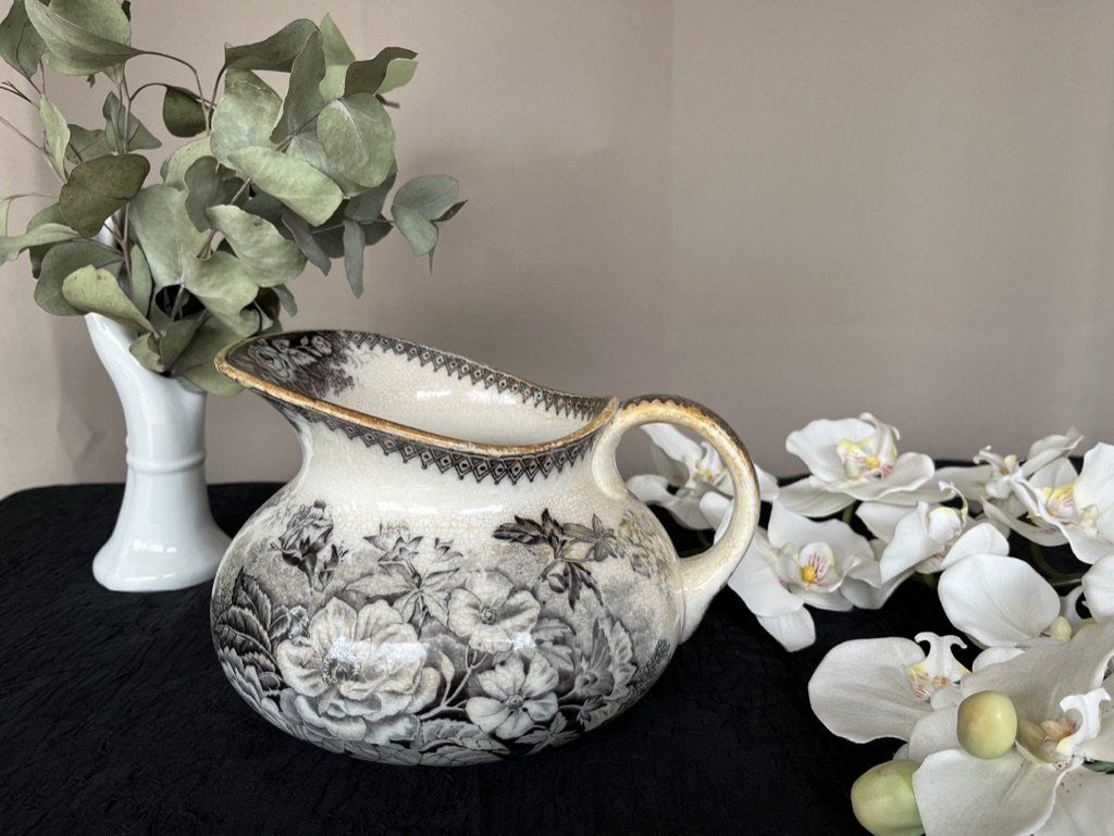 Ancien broc de toilette en faïence de Sarreguemines, modèle "Jardinière". Rare décor floral gris/noir sur fond blanc crème. Une pièce authentique avec une patine ancienne, idéale en vase pour un bouquet champêtre. Voir description détaillée.