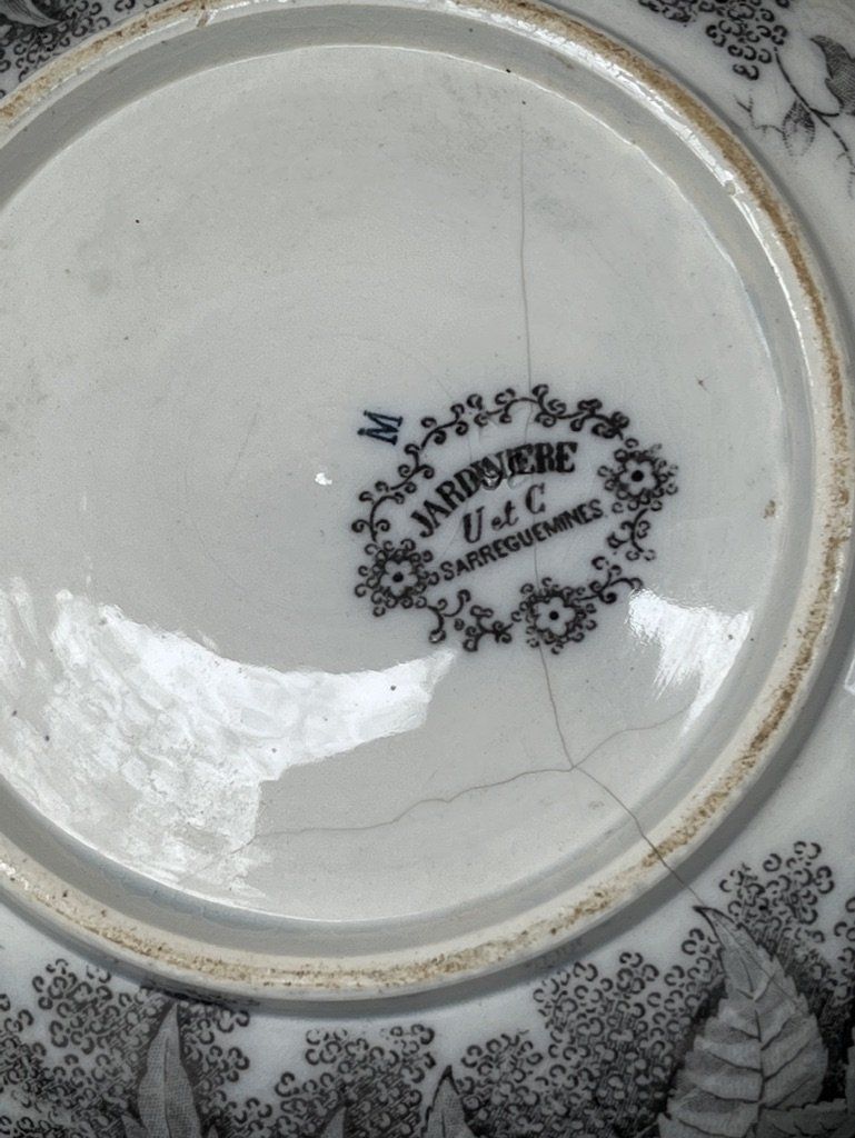 5 Assiettes anciennes en terre de fer, décor floral, Flore, U et C, Sarreguemines, 19ème siècle