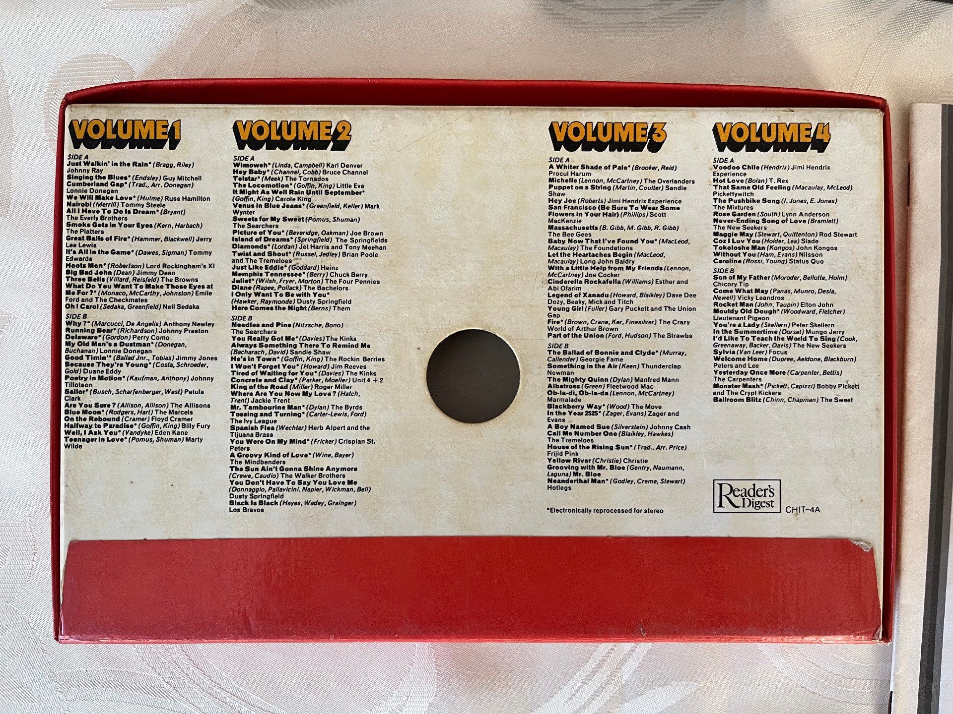 Coffret de 4 cassettes audio datant de 1979, Popular Music's Golden Hit Parade. Nombreux titres de l'époque à réécouter :) Voir listes des tubes sur les photos. Très bon état. Dimensions du coffret en carton 22,5 X 15 cm