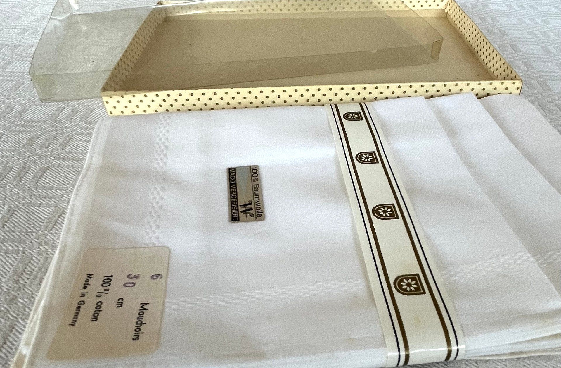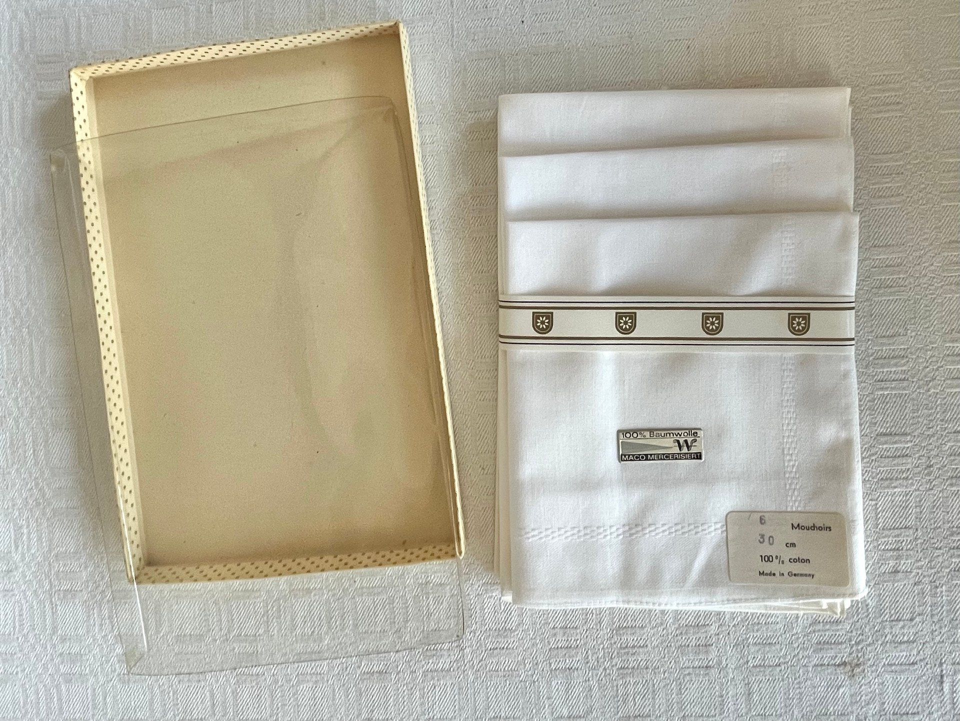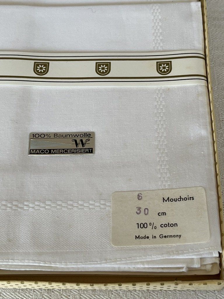 Magnifique coffret vintage contenant 6 mouchoirs blancs, neufs dans leur boîte d'origine. Confectionnés en Allemagne en pur coton Mako mercerisé, ils offrent une douceur et une brillance exceptionnelles. Qualité supérieure. Voir description.