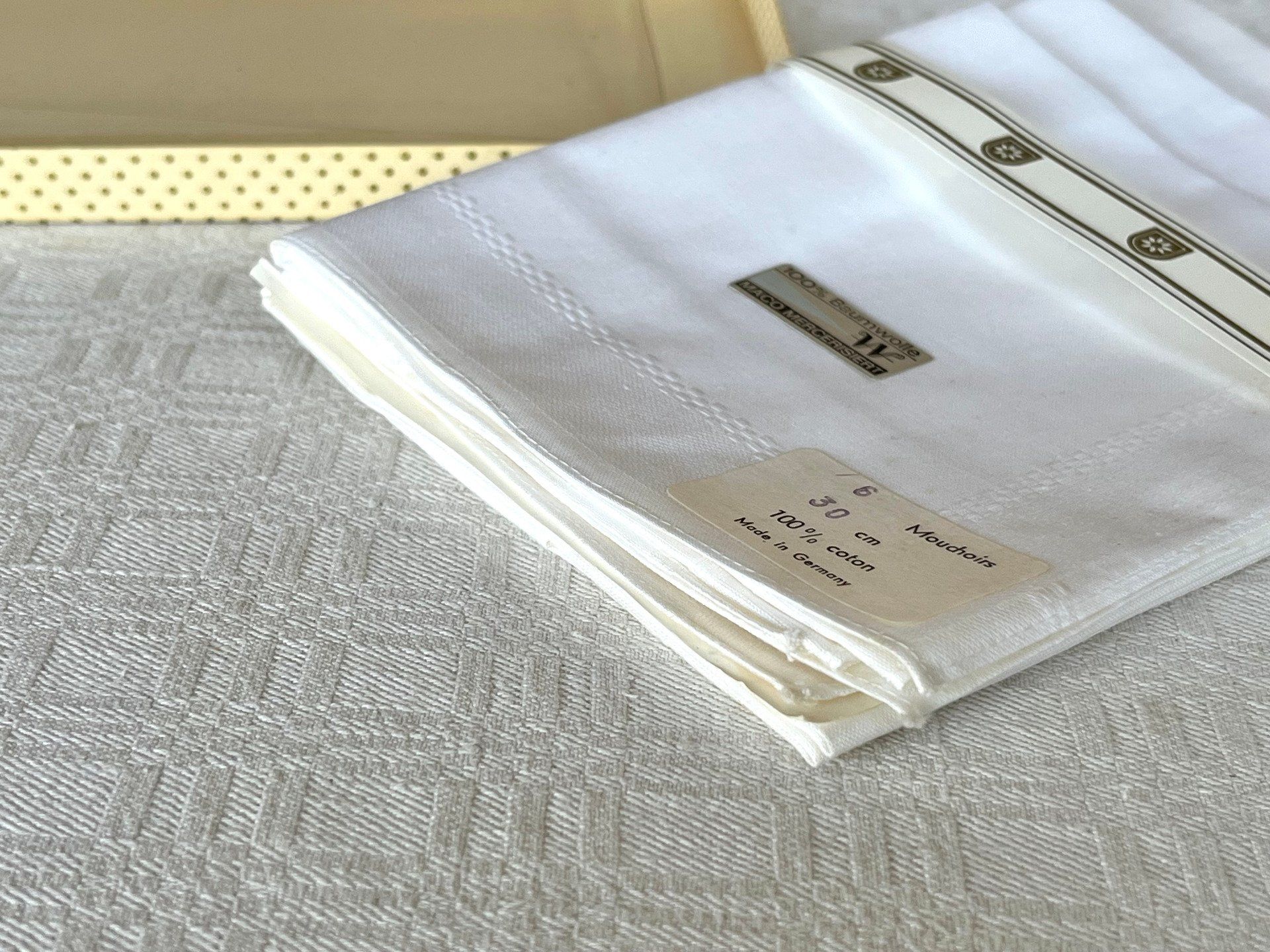 Coffret de 6 mouchoirs blancs neufs, 100% coton Mako mercerisé Made in Germany.