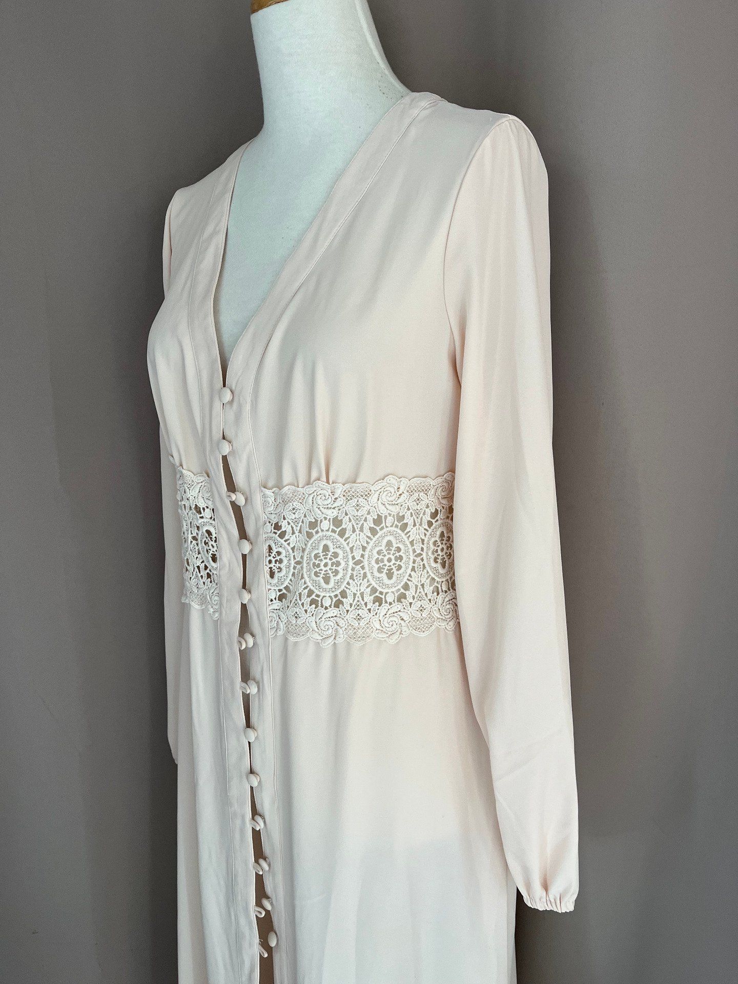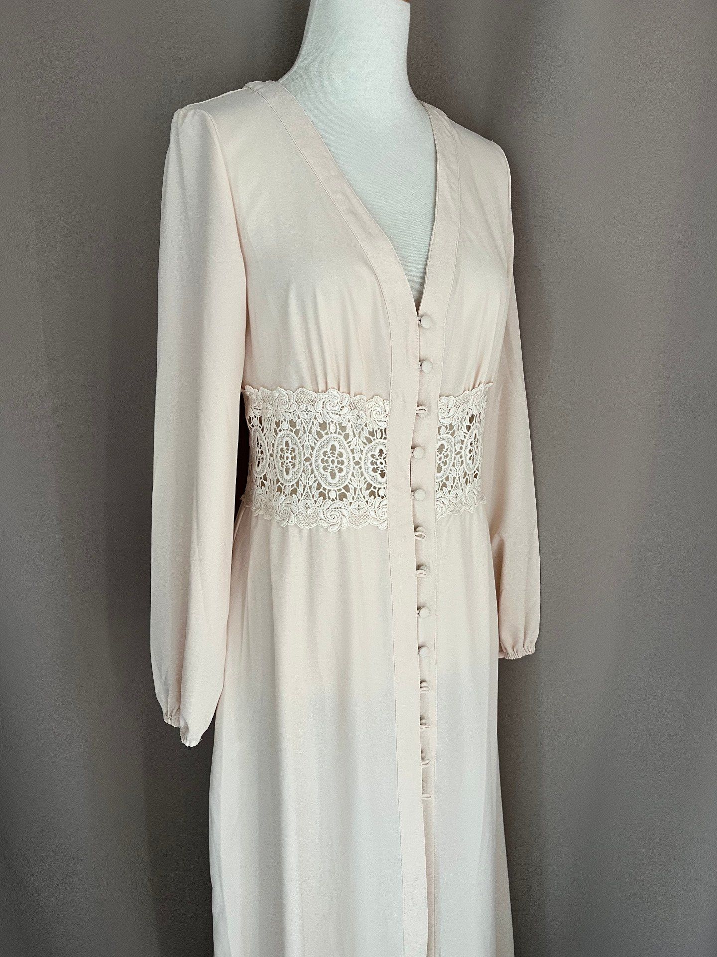 Magnifique déshabillé fluide long de couleur crème/beige sable/ivoire. Ce déshabillé est un vêtement très classe, léger et féminin, parfait pour être porté comme robe de chambre, tenue d'intérieur élégante. Neuf avec ses étiquettes. Voir description
