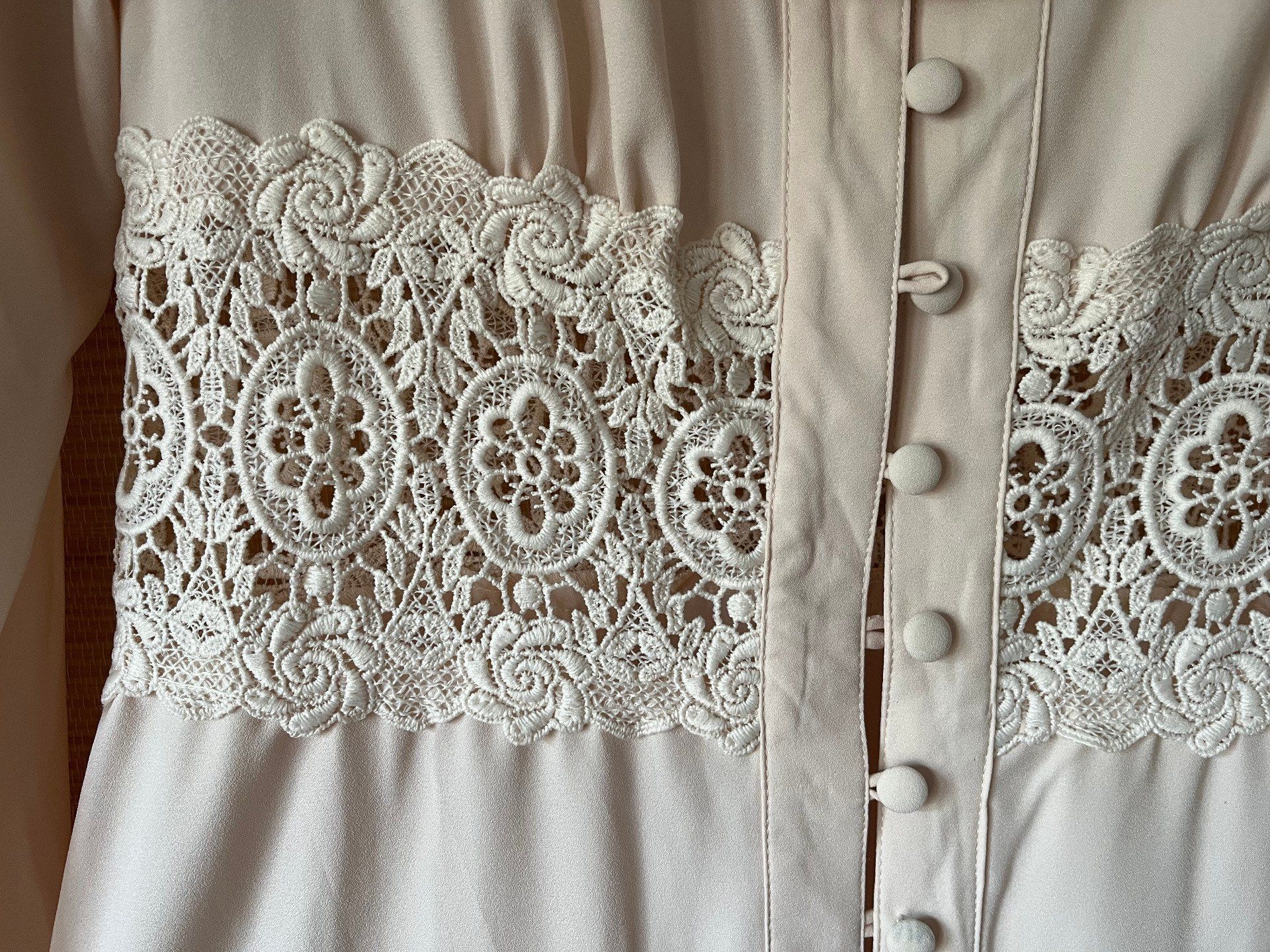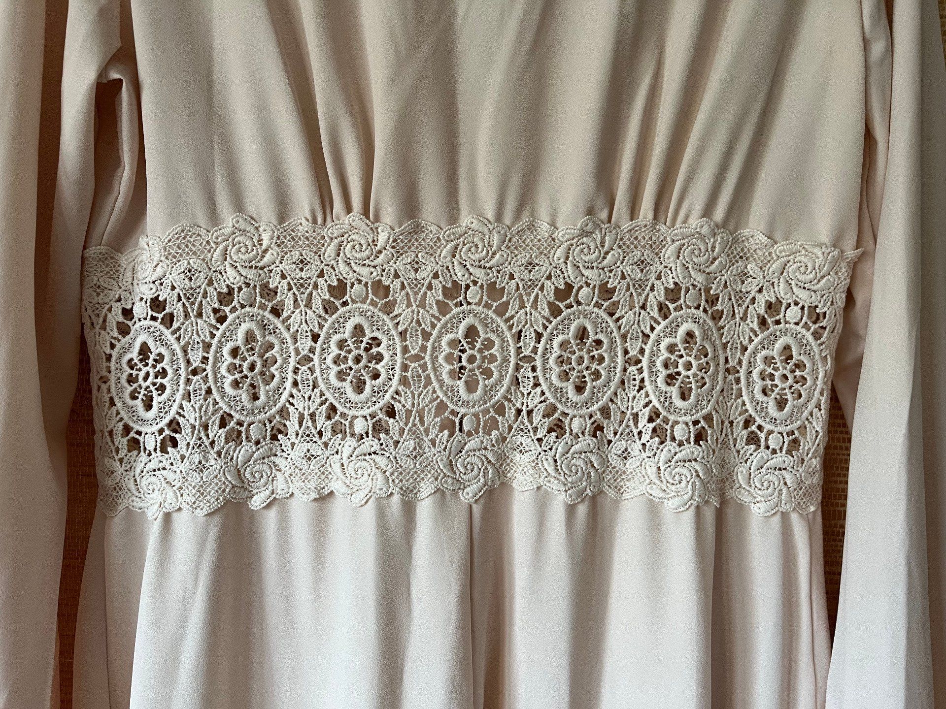 La caractéristique principale est l'empiècement de dentelle fine (probablement une dentelle de style guipure ou similaire) qui ceinture le devant au niveau de la taille empire ou sous la poitrine. Cette dentelle est d'une couleur crème ou ivoire très douce, contrastant légèrement avec le rose poudré du tissu principal, et présente des motifs floraux et géométriques.