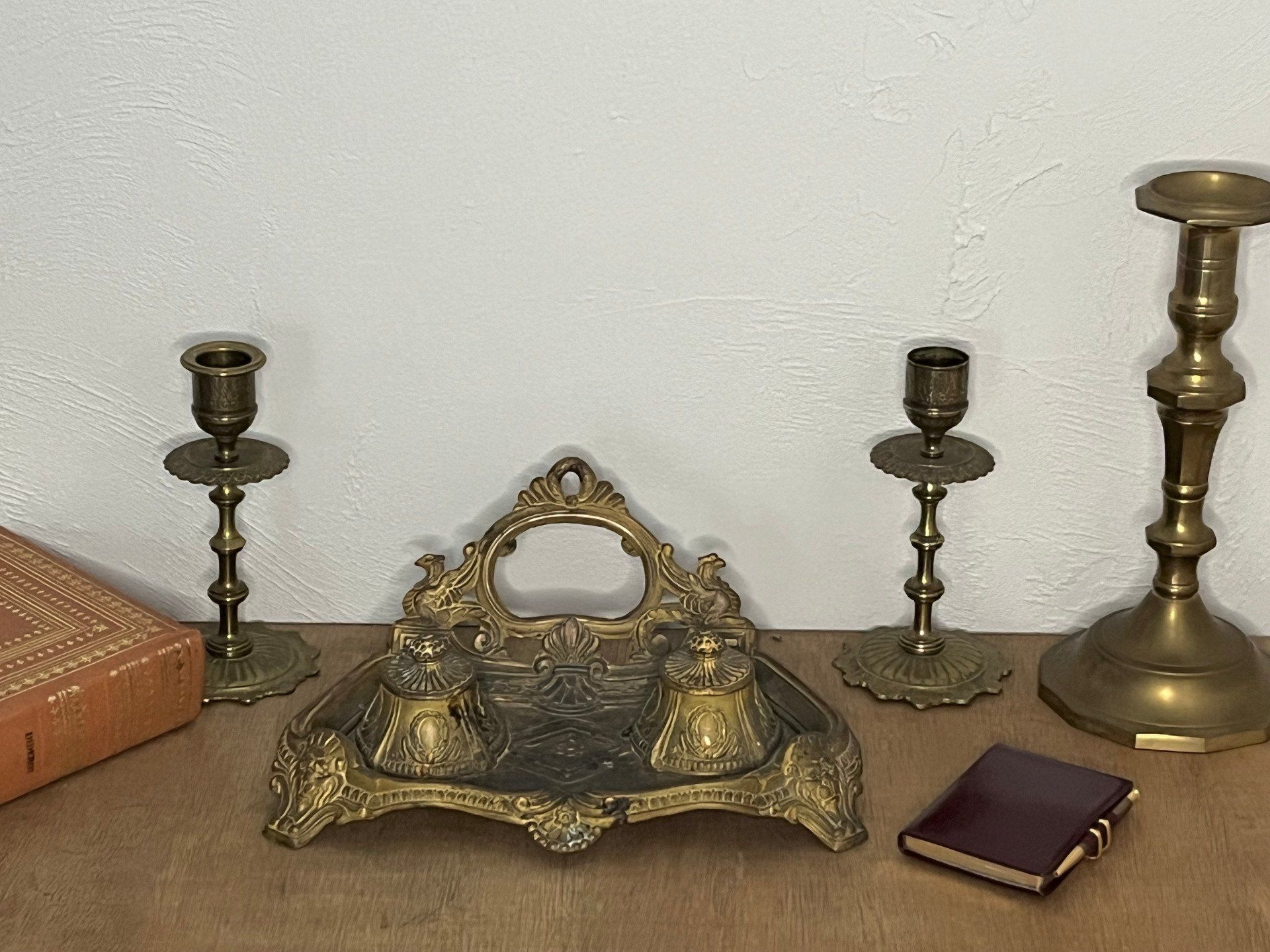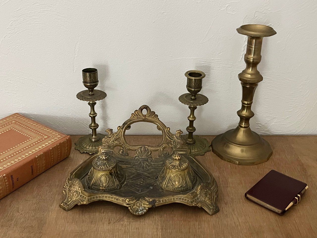 Magnifique bougeoir ancien en laiton à la patine chaleureuse et au design classique. Cette pièce élégante en excellent état est idéale pour sublimer une ambiance tamisée d'un bureau, d' une table ... Voir description