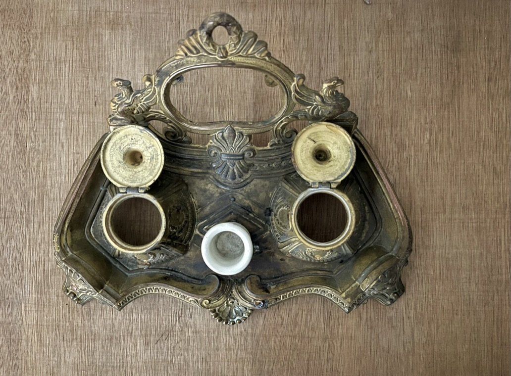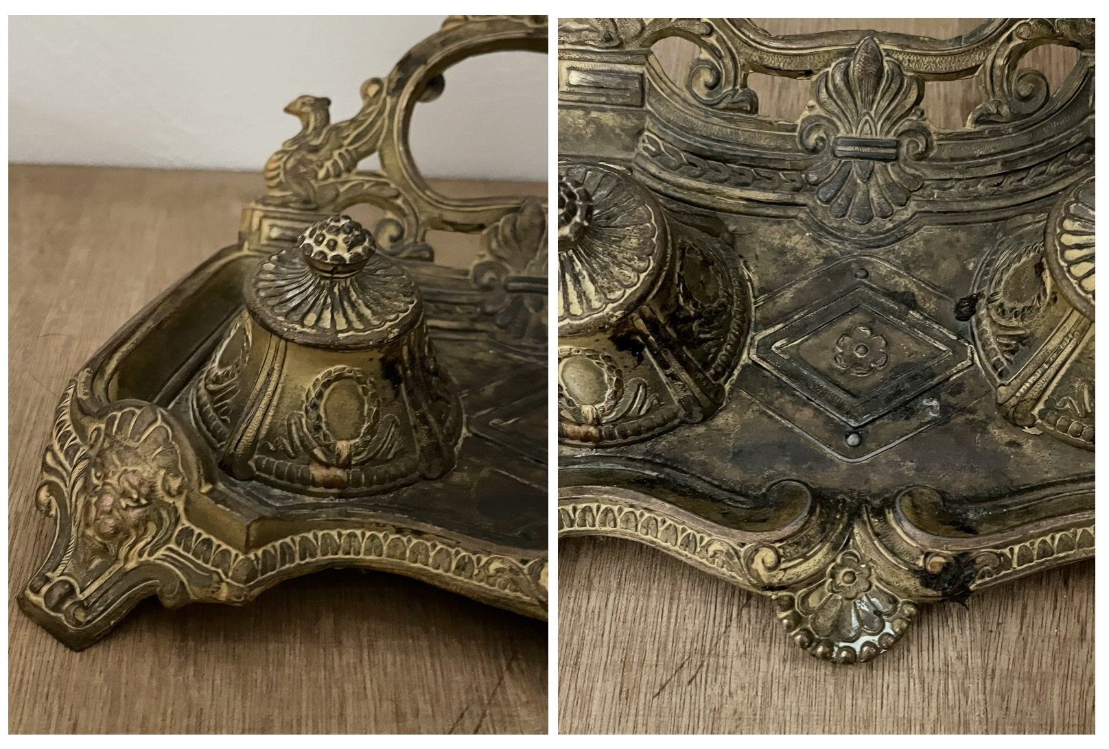 Élégant encrier double ancien de style Néo-Renaissance en métal doré orné de chimères et d une fleur de lys. Cet objet de bureau plein de caractère est idéal pour apporter une touche historique et raffinée à votre décoration d intérieur. Voir description