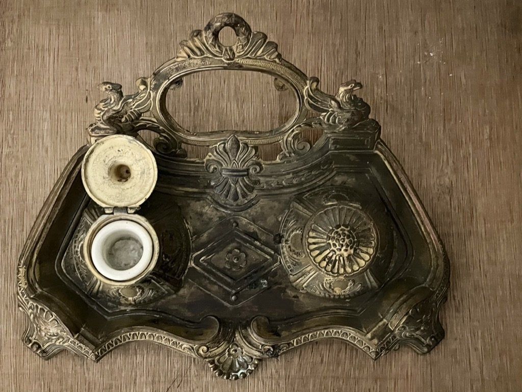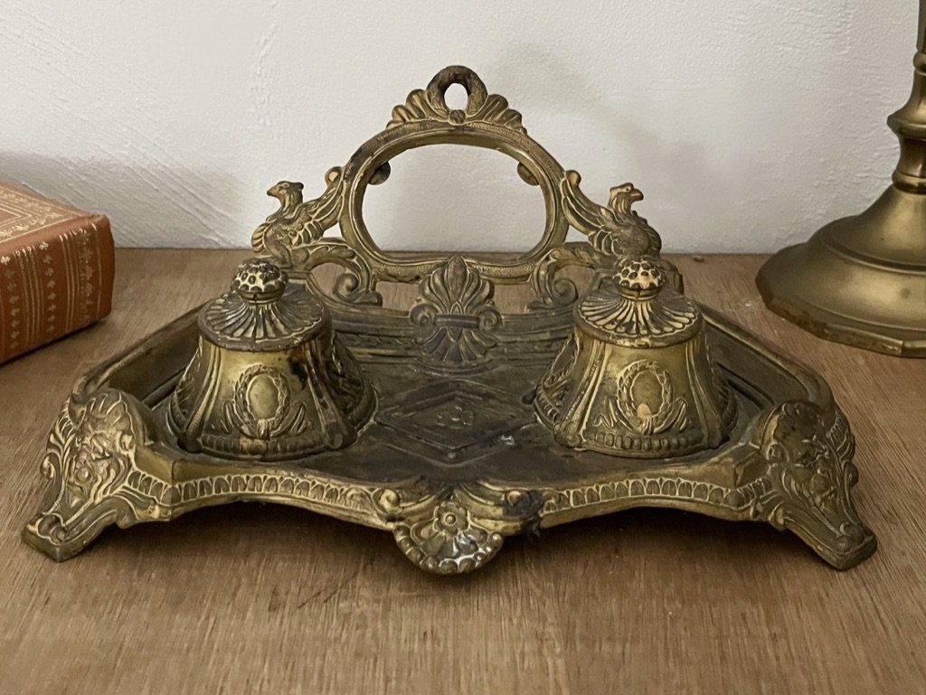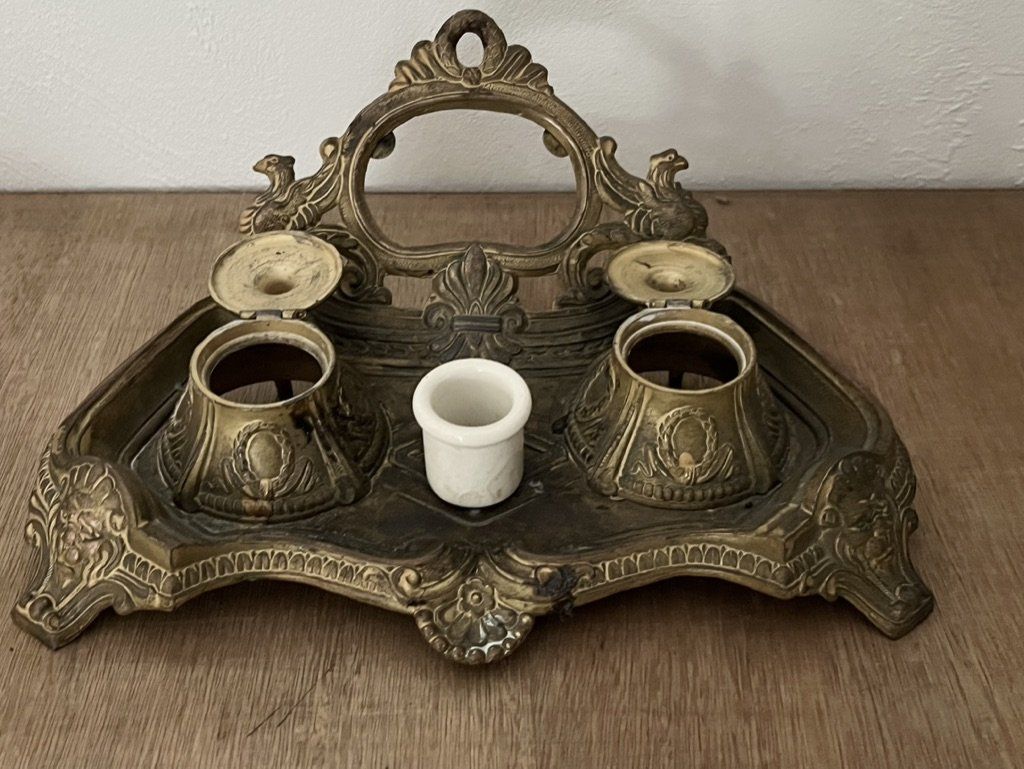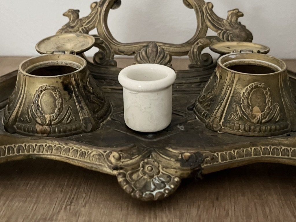Cet encrier est vendu dans son jus ce qui lui assure une patine véritable et un charme indéniable. Il possède l'un de ses deux godets d origine en céramique blanche et présente un emplacement à l arrière pour un médaillon ou un accessoire à compléter par vos soins.