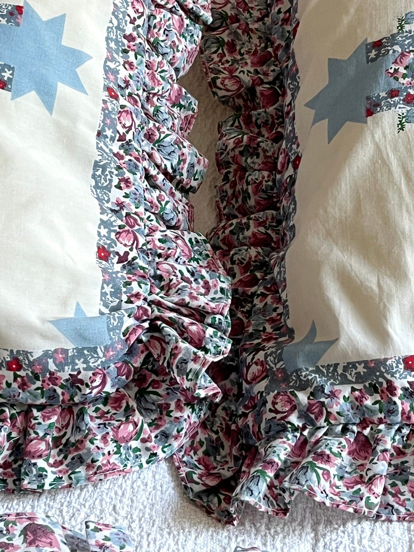 Le volant assorti utilise le même tissu fleuri du motif central, créant une bordure froncée et romantique.