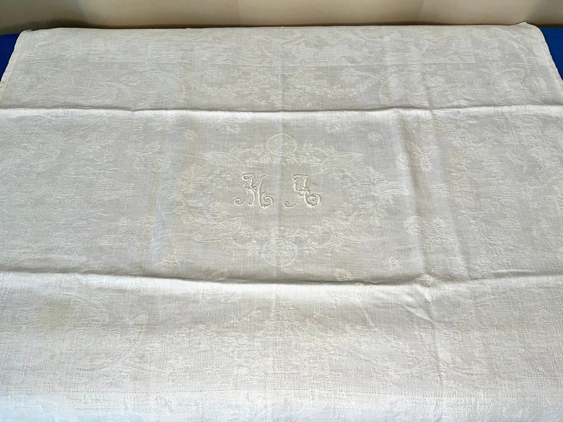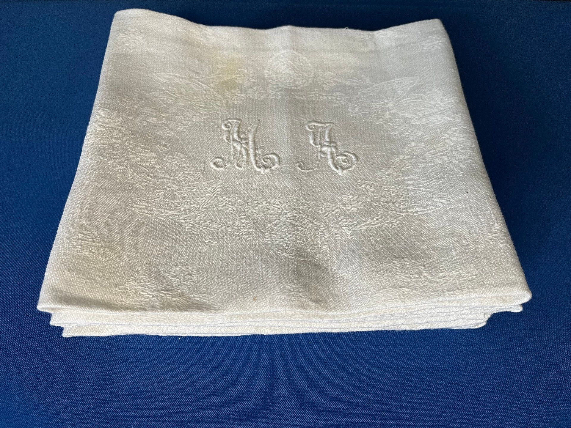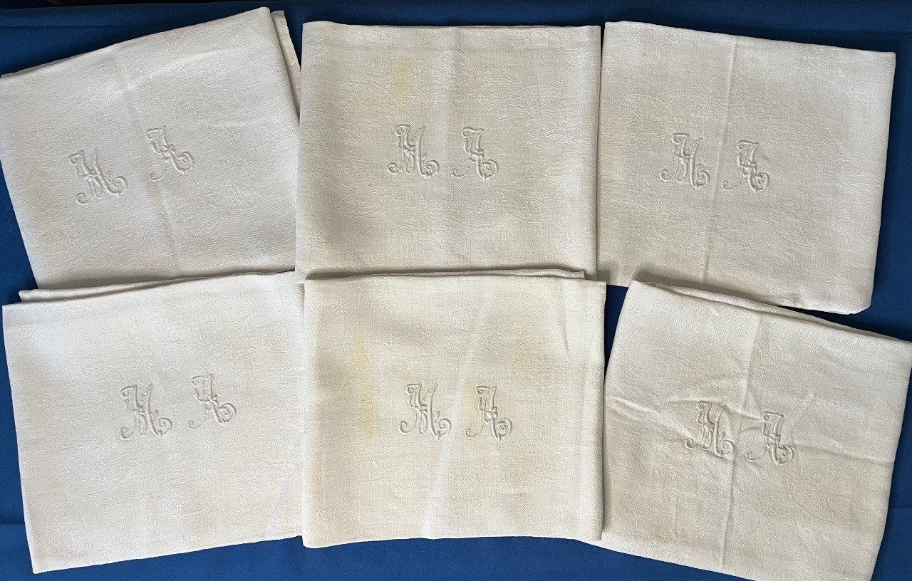 Ensemble de six grandes serviettes de table anciennes en tissu damassé blanc, idéal pour une table élégante. Le tissage damassé présente de délicats motifs floraux ou ornementaux. Chaque pièce est ornée des initiales M A. Voir description