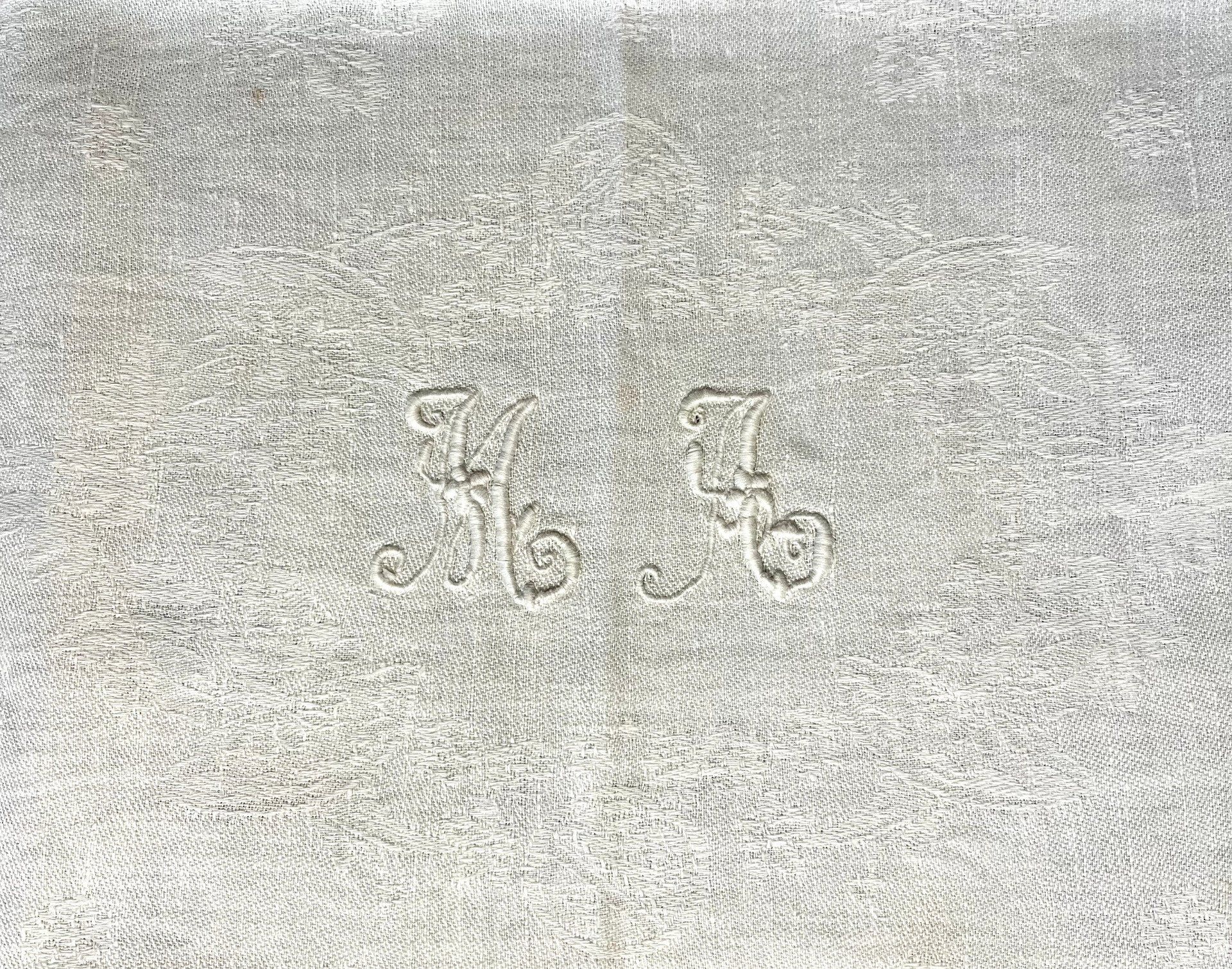 Au centre, chaque serviette est personnalisée par un élégant monogramme brodé représentant les initiales M. A. dans un style cursif ornementé.