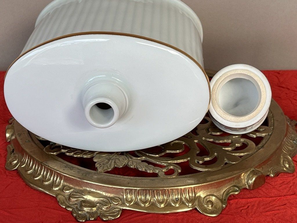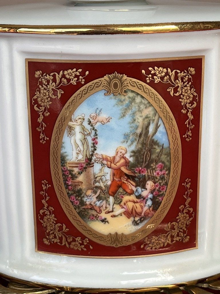 Élégante carafe de collection en porcelaine de Limoges Castel, ornée d'une scène galante de style Fragonard. Rehaussée d'un décor à l'or 22 carats sur fond blanc, cette pièce raffinée apportera une note de noblesse à votre bar ou vitrine. Voir description