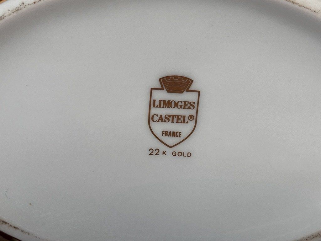 L'objet mesure 14,5 cm de hauteur seule et atteint 18,5 cm avec son bouchon d'origine, sur une base de 14 x 9 cm. La signature sous la base "Limoges Castel, France, 22k Gold" garantit l'authenticité de cette pièce de prestige.