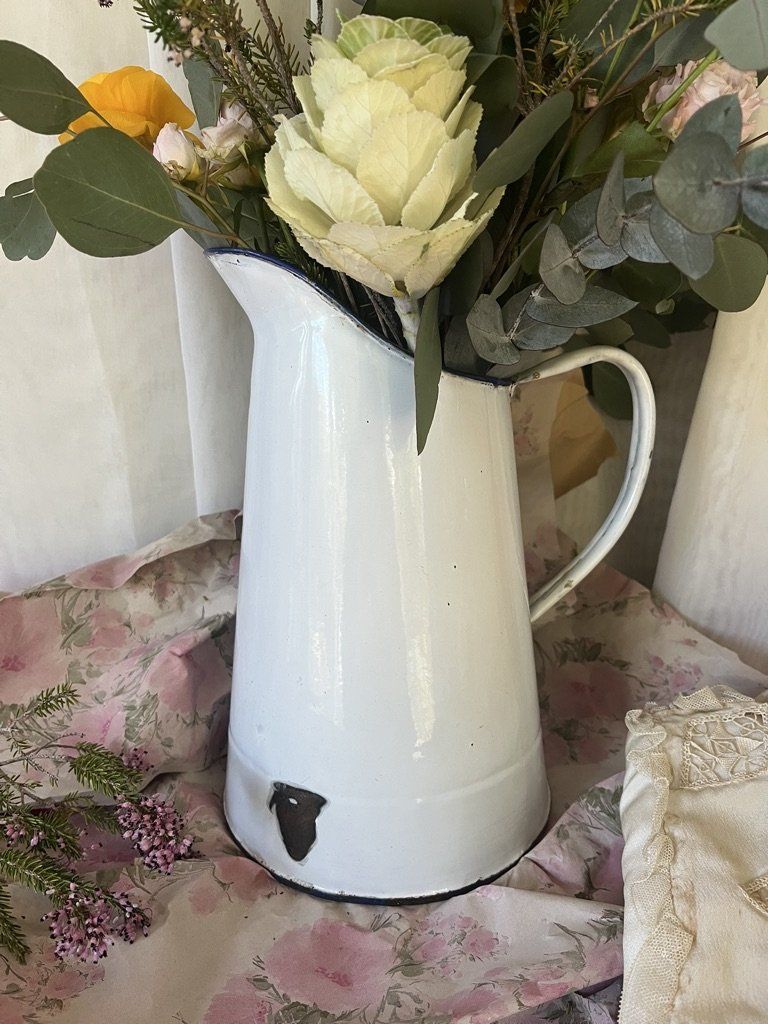 Magnifique broc ancien en métal émaillé parfait pour ajouter une touche d'authenticité et de charme, style campagne, shabby chic à votre intérieur. Parfait comme grand vase pour des fleurs sèches ou fraîches. Voir description