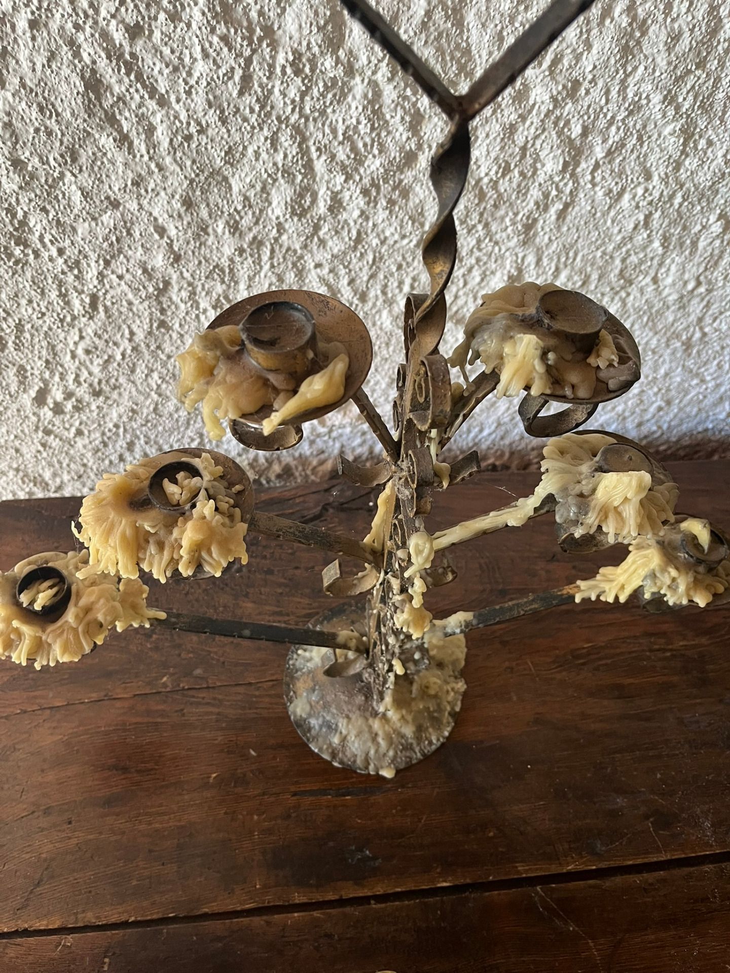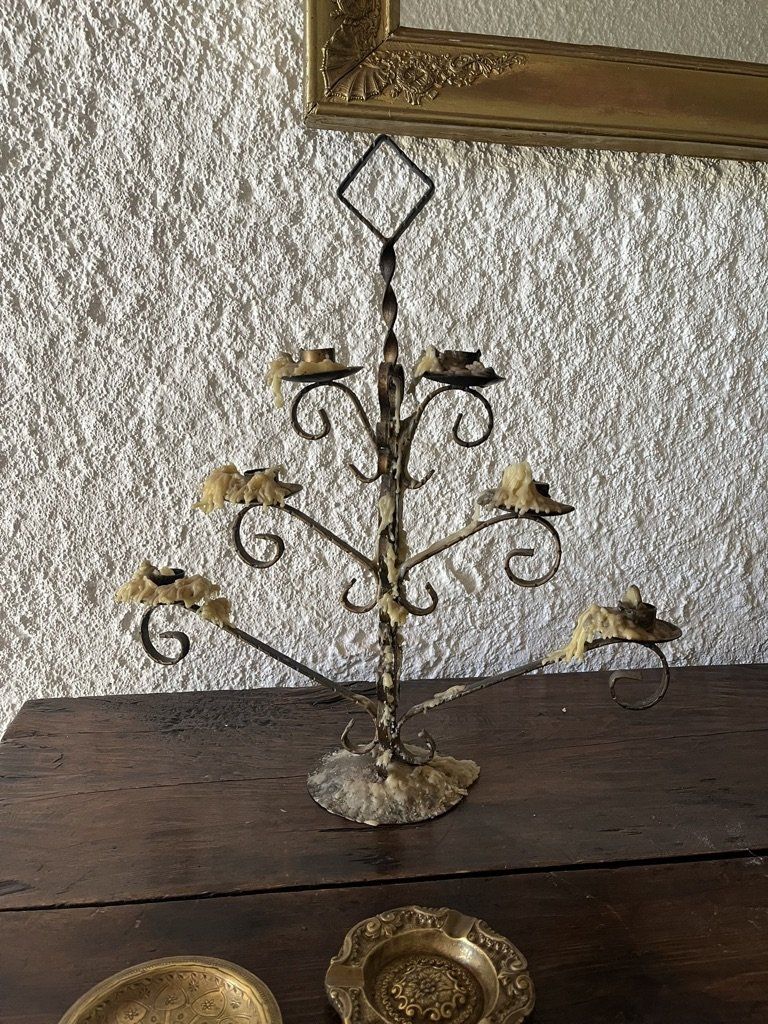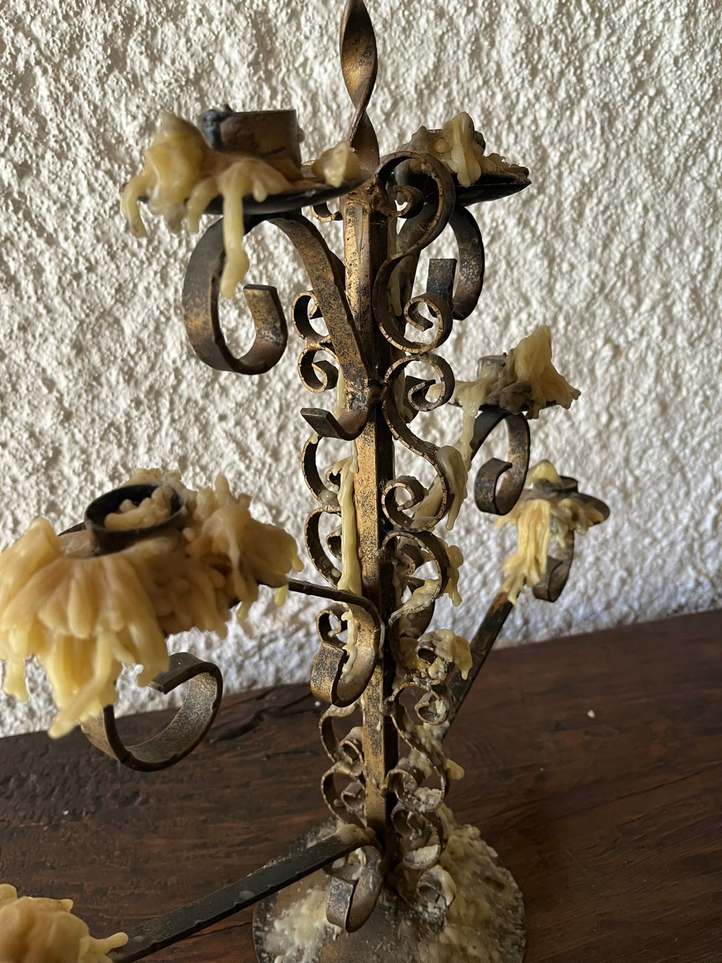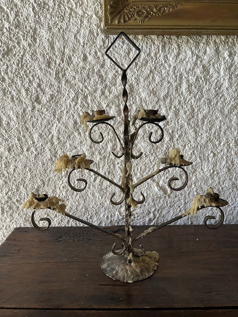 Candélabre ancien très décoratif ! Fait main, en fer forgé, il a 6 portes bougies, en laissant la cire couler ce chandelier dégage beaucoup de charme ! Pratique avec sa poignée, il peut passer facilement se déplacer. Voir description