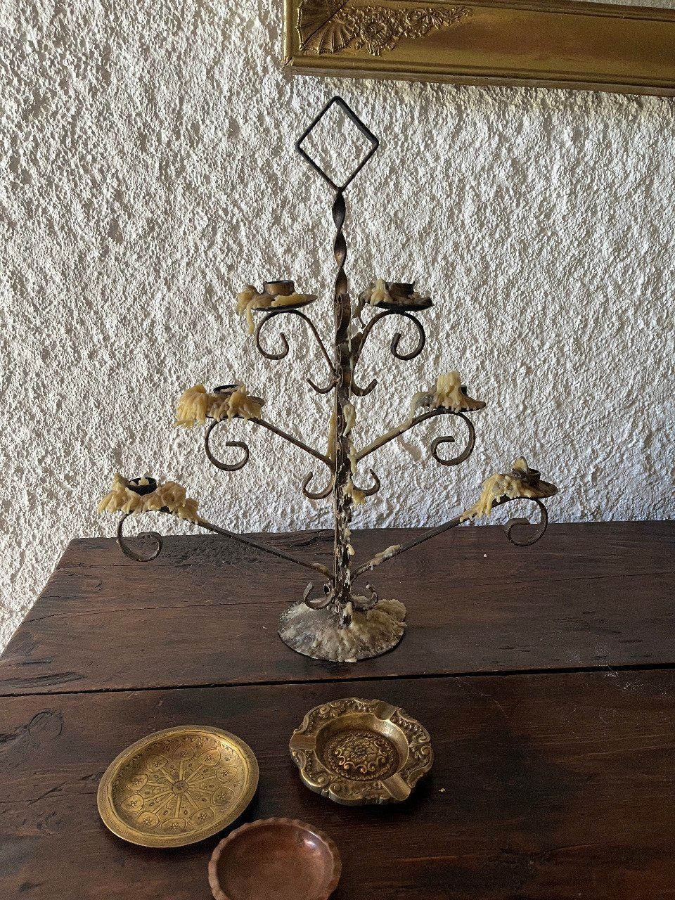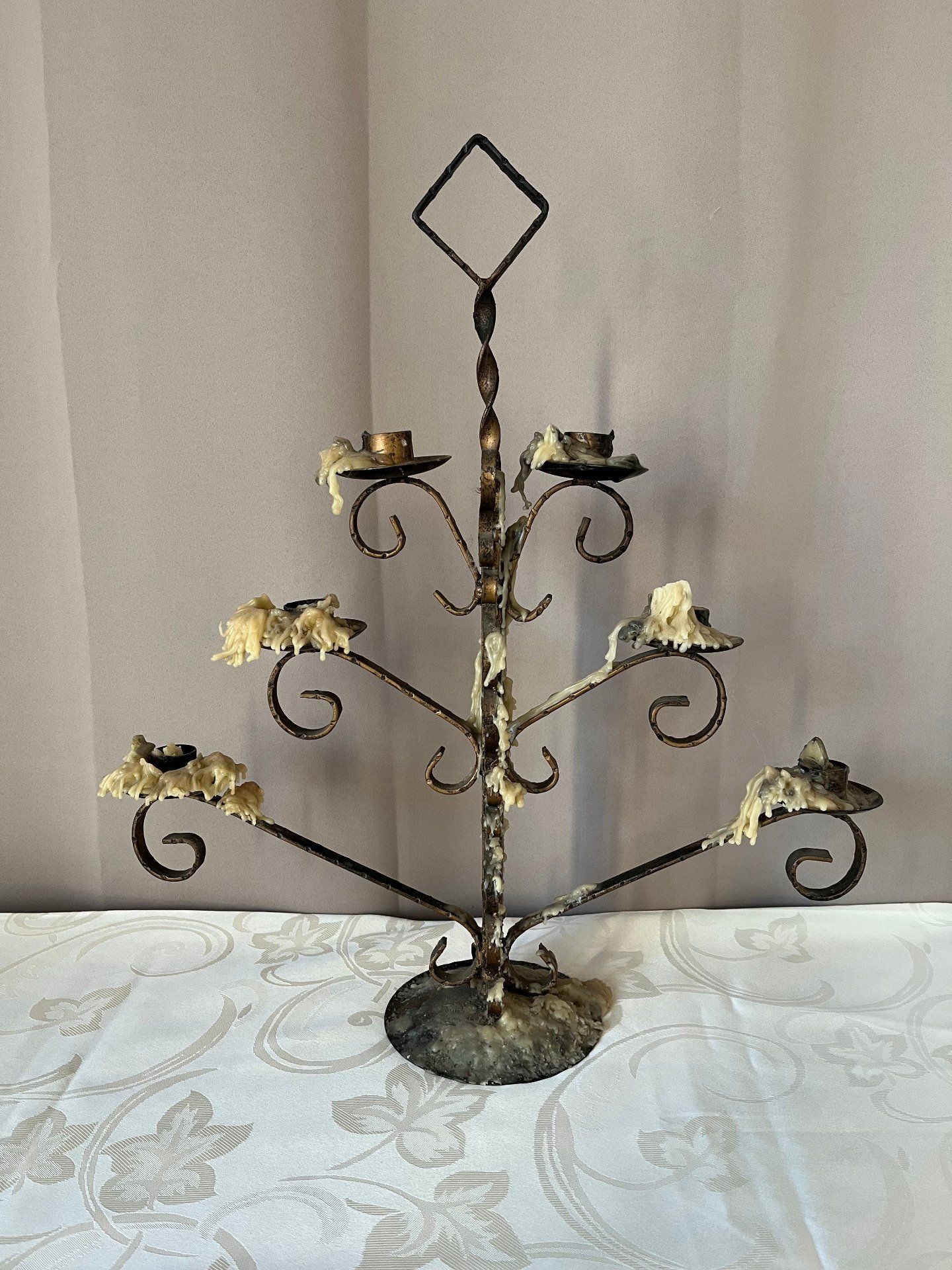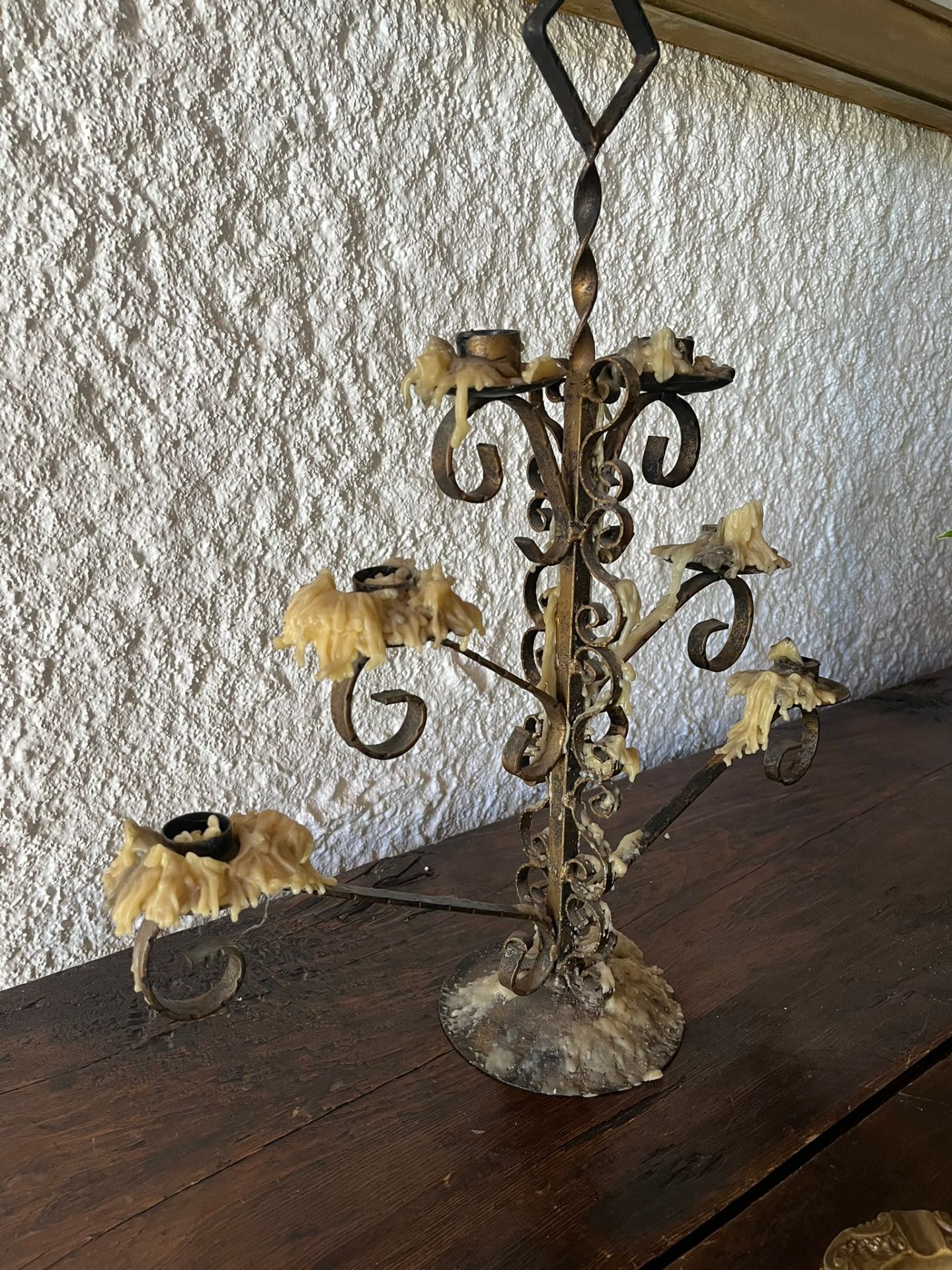 Candélabre ancien très décoratif ! Fait main, en fer forgé, il a 6 portes bougies, en laissant la cire couler ce chandelier dégage beaucoup de charme ! Pratique avec sa poignée, il peut passer facilement se déplacer. Voir description