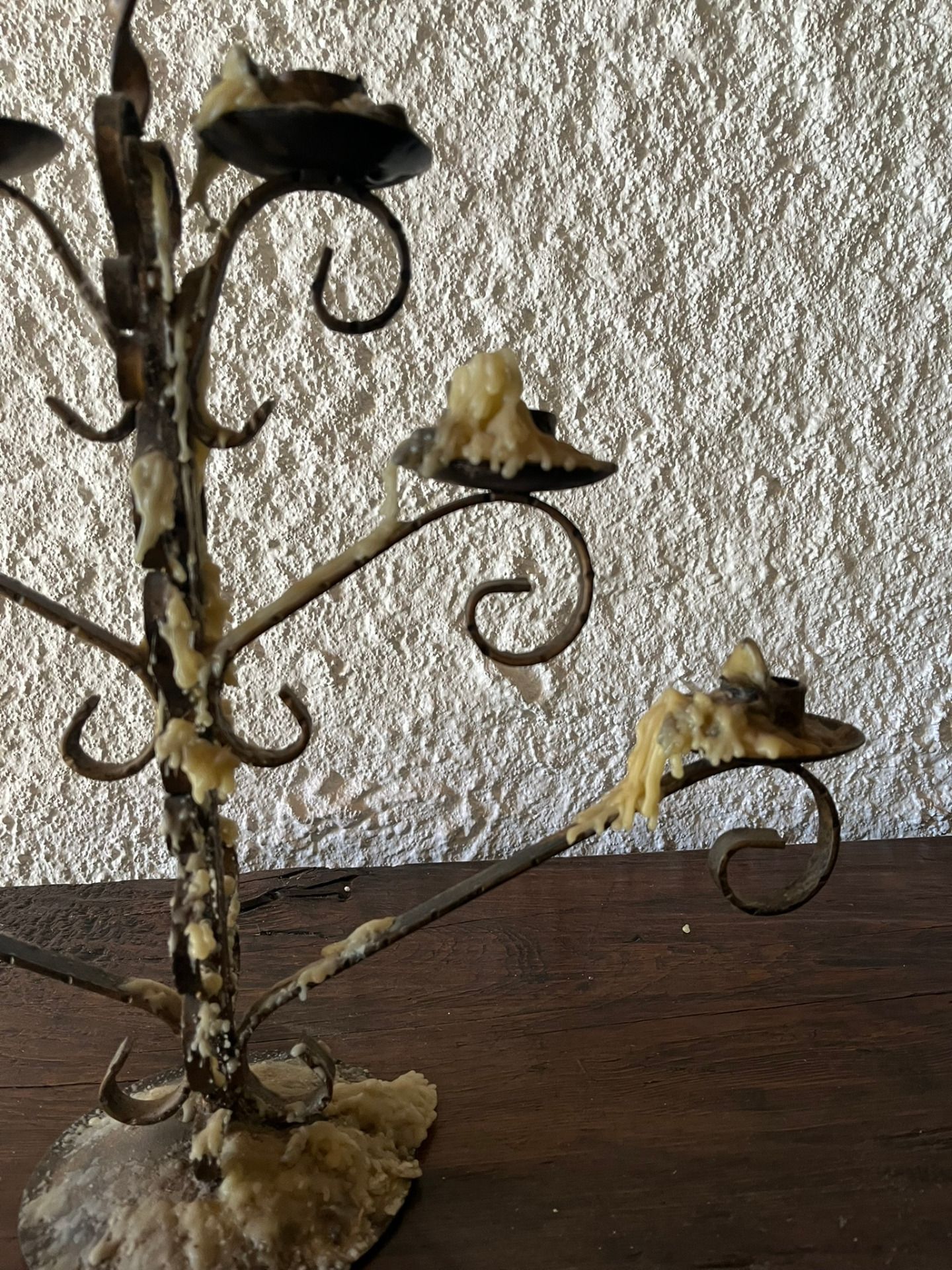 Candélabre en bel état, vous pouvez garder ces coulures qui lui donne son charme ou les enlever pour en faire couler d'autres de couleur differente ....