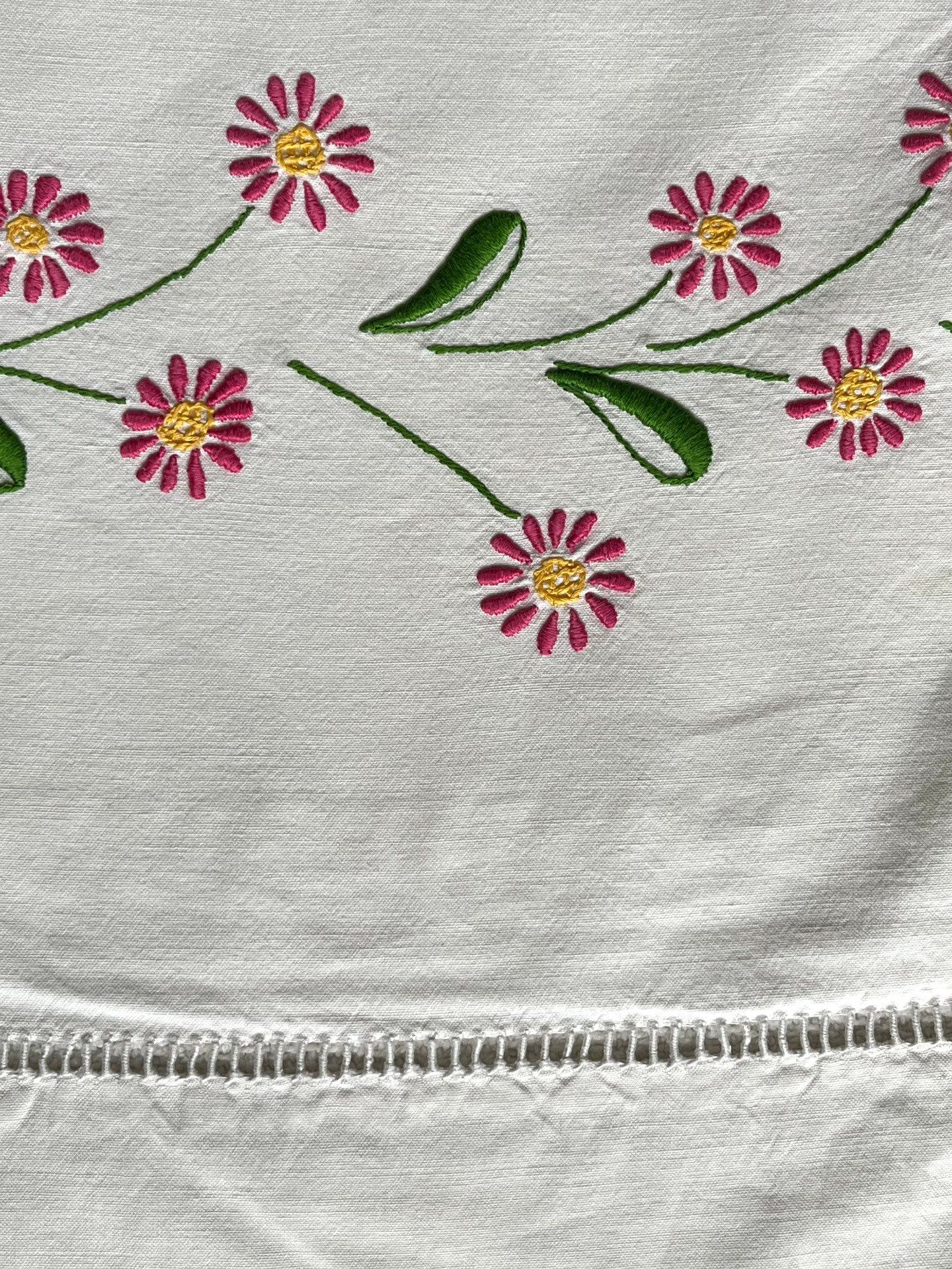 Grand drap ancien en coton, monogramme MR et broderie marguerites