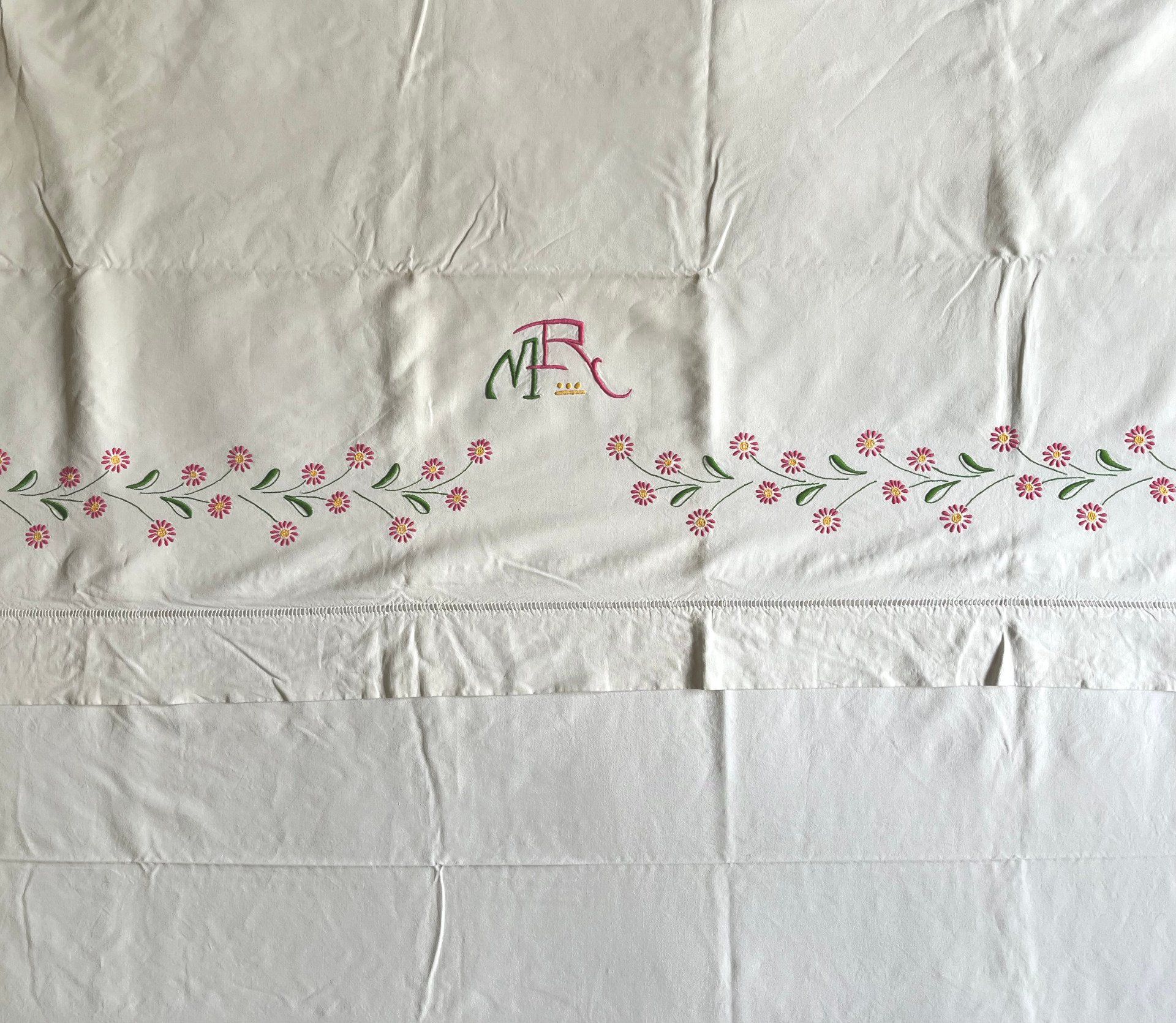 Le revers est orné d'une magnifique et délicate broderie de marguerites (ou motifs de petites fleurs) qui court sur toute la largeur du drap. Le drap est orné d'un élégant monogramme brodé "MR", ajoutant une histoire et un cachet unique. Un travail d'une finesse remarquable, typique du trousseau d'autrefois.