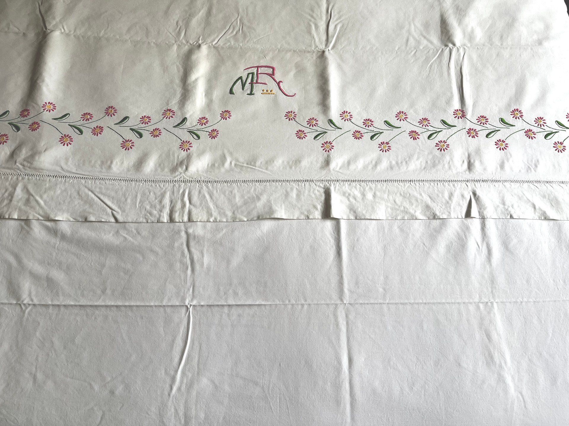 Splendide et rare grand drap de lit ancien, un véritable trésor de linge d'héritage qui ajoutera une touche de charme romantique et d'authenticité à votre chambre. Le drap est brodé de petites fleurs et initiales "MR" en couleur. Voir description