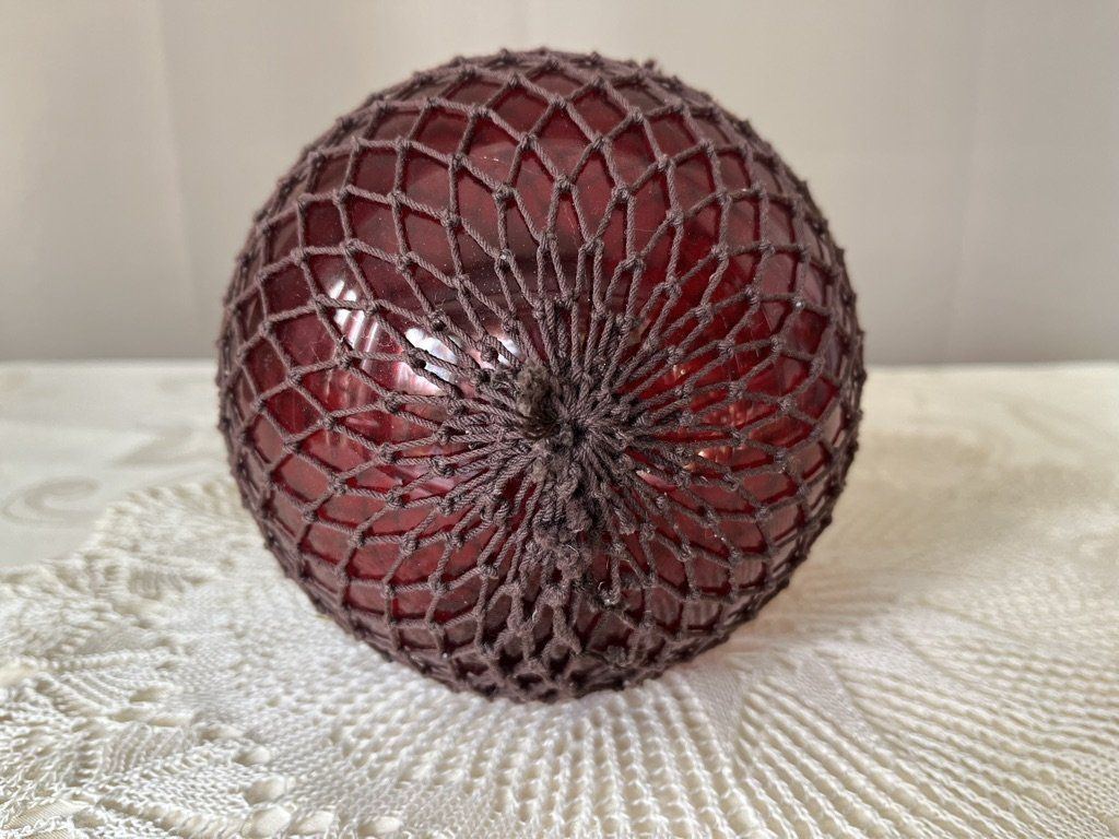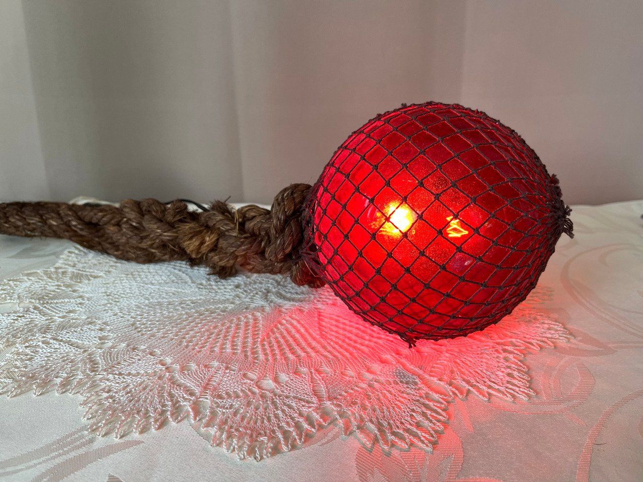 Ancien flotteur utilisé jusque dans les années 70, constitué d'une bouée en verre rouge entouré d'un cordage tressé. Cette bouée de pêcheur à été transformé en éclairage d'ambiance avec une ampoule à l'intérieur. Voir description