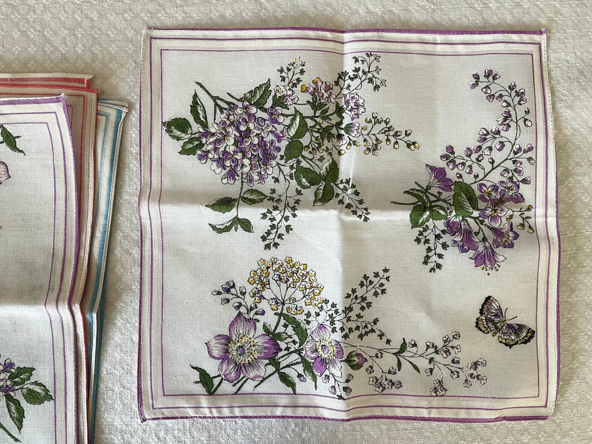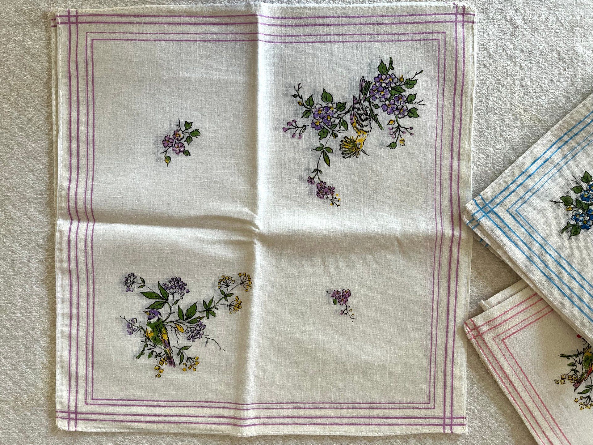 Ensemble de 6 mouchoirs en 100% coton, neuf, fabriqué en France. Chaque série comprends 2 mouchoirs de chaque couleur, donc 2 bleus, 2 roses et 2 violets Vous avez le choix entre 3 modèles, Papillon, Oiseaux ou Fleurs. Dimension d'un mouchoir 30 X 30 cm.