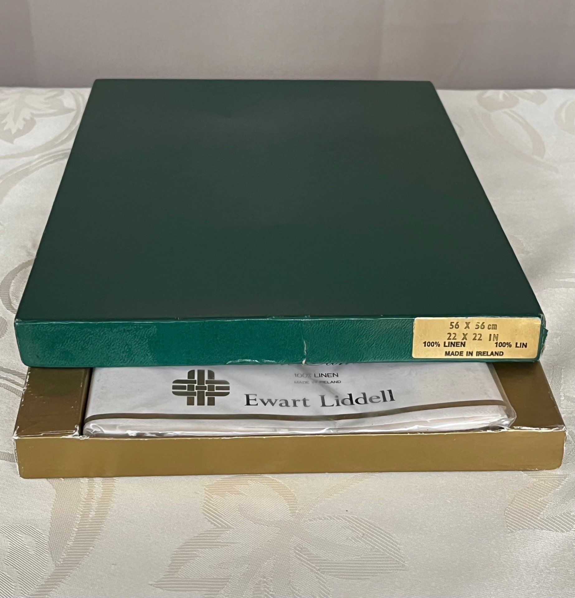 Le prix tient compte de la qualité exceptionnelle du lin damassé irlandais, de la renommée de la maison Ewart Liddell, de l’état strictement neuf de l’ensemble dans son emballage d’origine, ainsi que de la rareté de ce type de linge ancien haut de gamme aujourd’hui difficile à trouver dans cette condition.