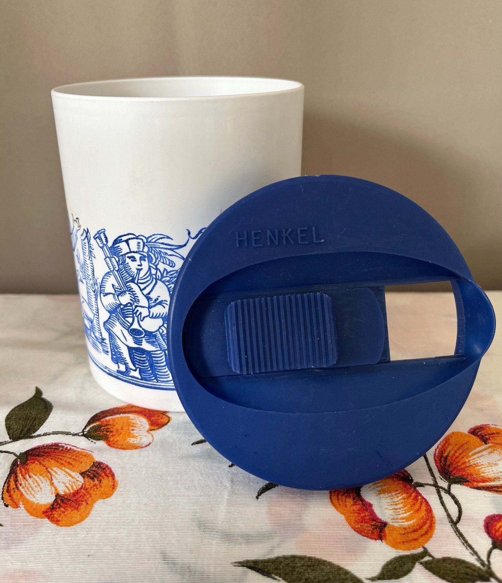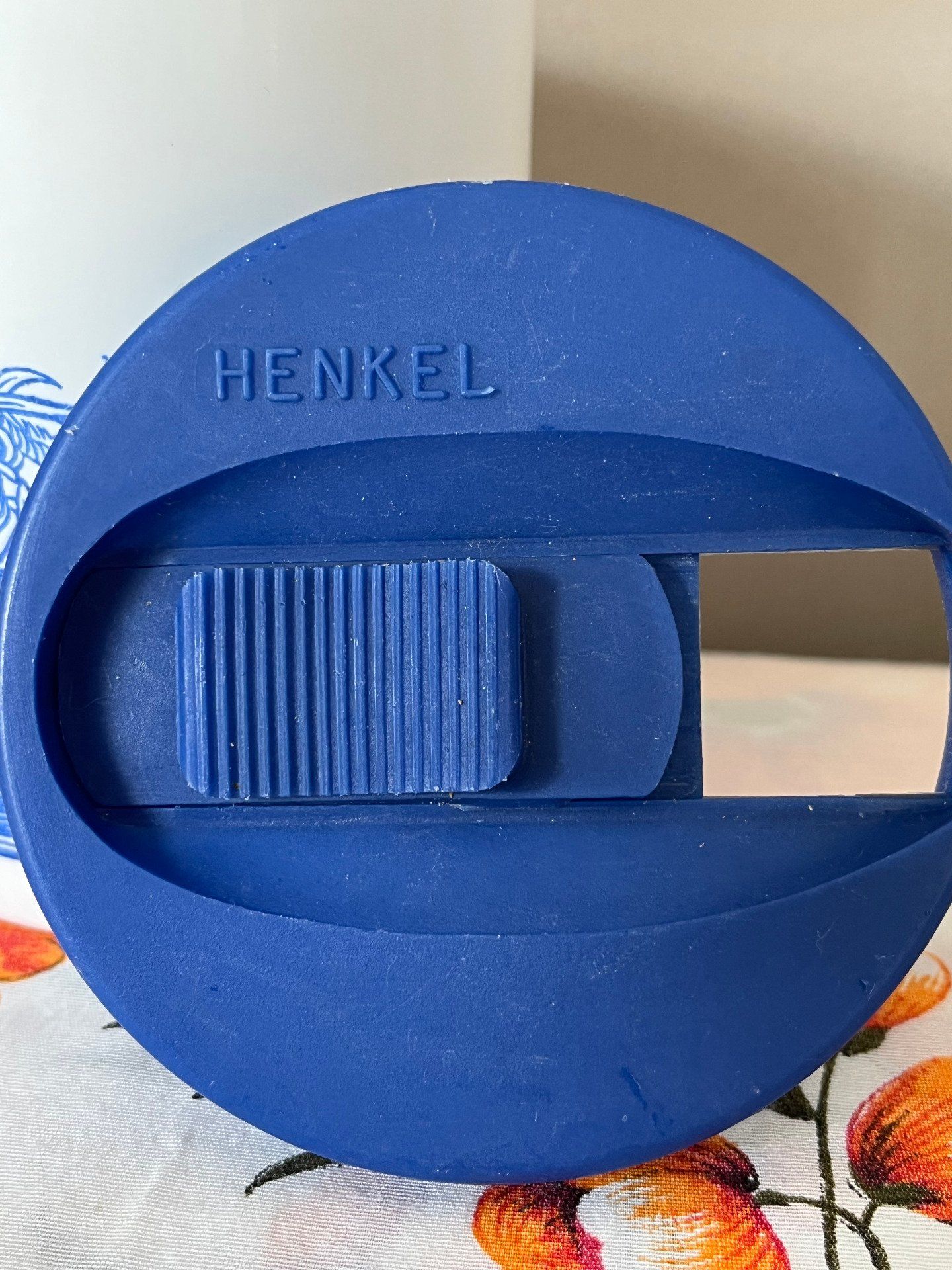 - Le pot Henkel, au décor de personnages bleues est très original ! Sur le couvercle verseur il est noté Henkel. Boite pratique pour le sucre, la farine ... Hauteur 13,2 cm, diamètre 10 cm. En bon état, l'intérieur du pot est jauni, à l'extérieur quelques traces d'utilisation, voir photos.