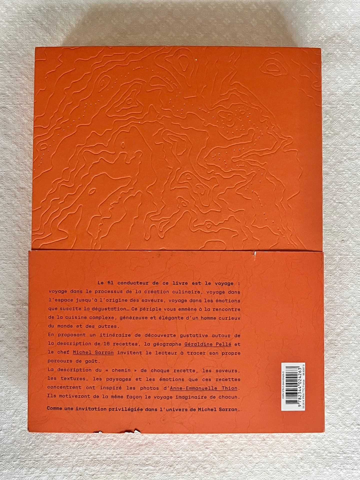 Ce qu'en dit Michel Sarran : Le 15 novembre sortira en librairie mon premier livre personnel, « Itinéraires de Goûts ». Je ne suis pas peu fier de vous présenter en avant-première la merveille : un beau pavé de 392 pages à la couverture orange sobre rehaussé d'un portrait noir et blanc. Ce livre est un OVNI dans l'édition culinaire et il tient à la rencontre que j'ai faite avec Géraldine Pellé, brillante docteur en géographie humaine (Université de Toulouse II et Université de Genève), qui en signe les textes. Cette spécialiste du paysage et du goût en tant qu'expérience sensible de l'espace m'a cuisiné pendant quatre ans afin « d'accoucher » de ce projet ambitieux et sensible, élaboré en connivence avec la photographe Anne-Emmanuelle Thion. « Itinéraires de Goûts » n'est pas un livre de recettes, ou si peu. Il n'y en a que seize (pour 392 pages !). Ce livre se veut plutôt un périple atypique plongeant au cœur du processus de création culinaire, à l'origine des saveurs et dans les émotions que suscite la dégustation. Une invitation privilégiée à entrer dans ma cuisine à la fois complexe, généreuse et élégante et dans mon univers. Bon voyage !
