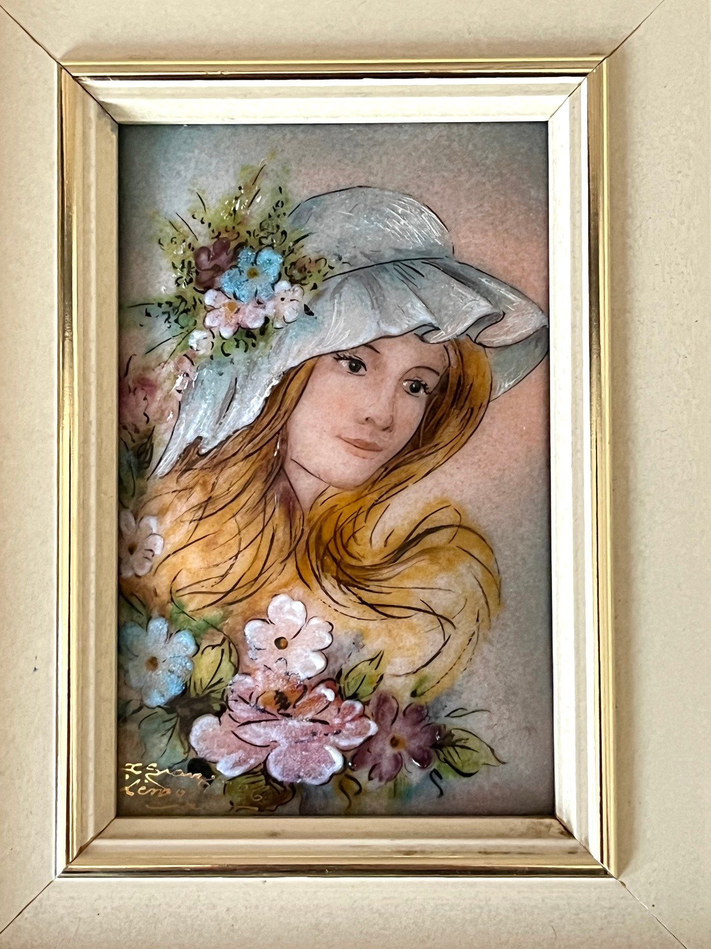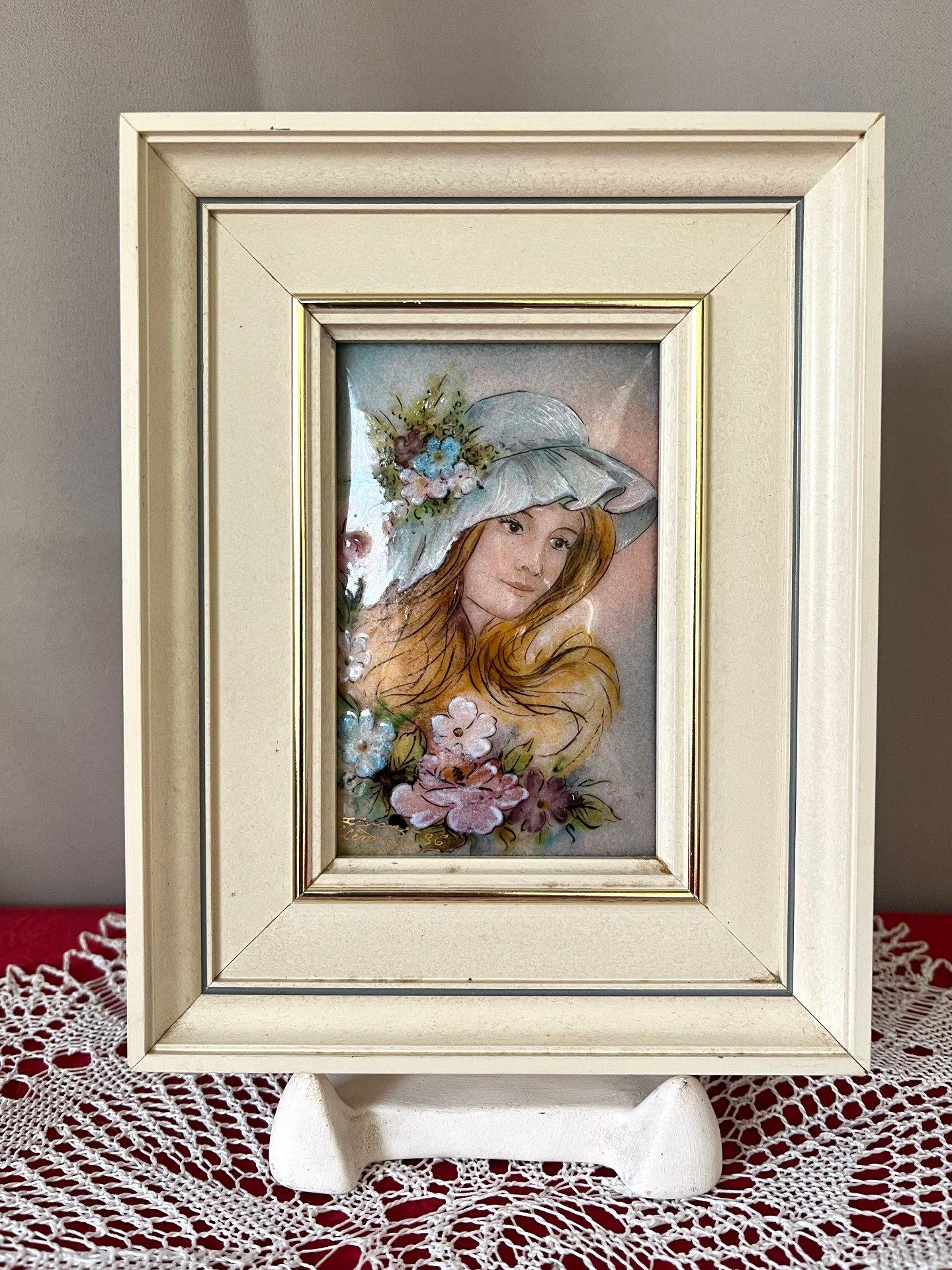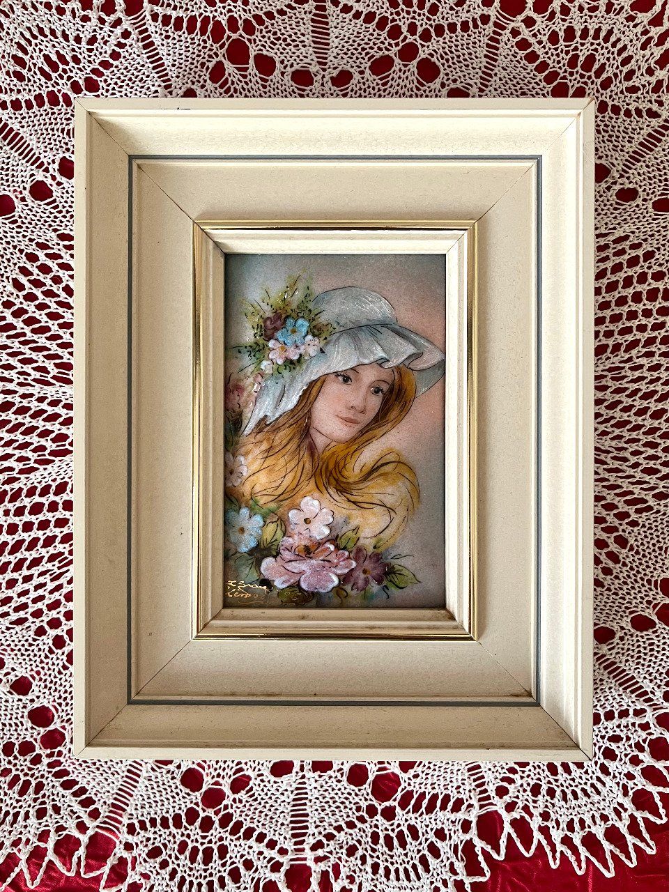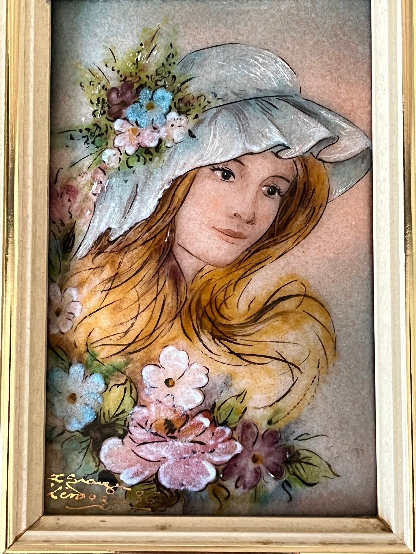 Très joli mini tableau vintage, plaque en émail de Limoges signée par l'émailleur renommé J. Granger représentant le portrait d'une jeune femme. Travail d'une grande finesse, émail brillant en parfait état. Voir descriptif détaillé