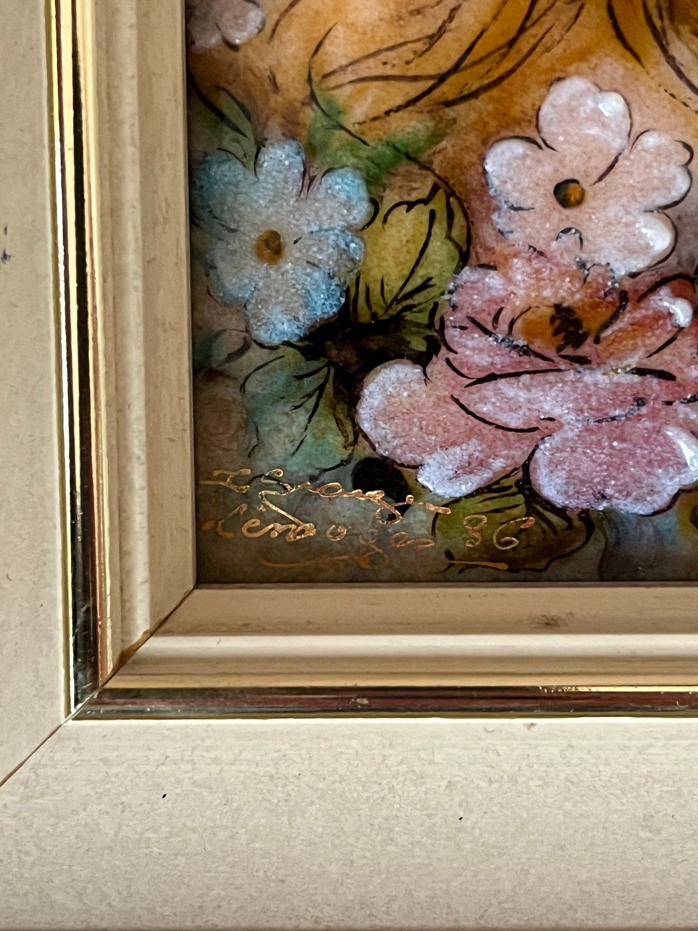 La technique de Granger se reconnaît ici à la superposition des couches d'émail qui donne un aspect presque porcelaine au grain de peau et un relief subtil aux pétales des fleurs. L'ensemble est présenté dans son cadre d'origine avec une baguette dorée.