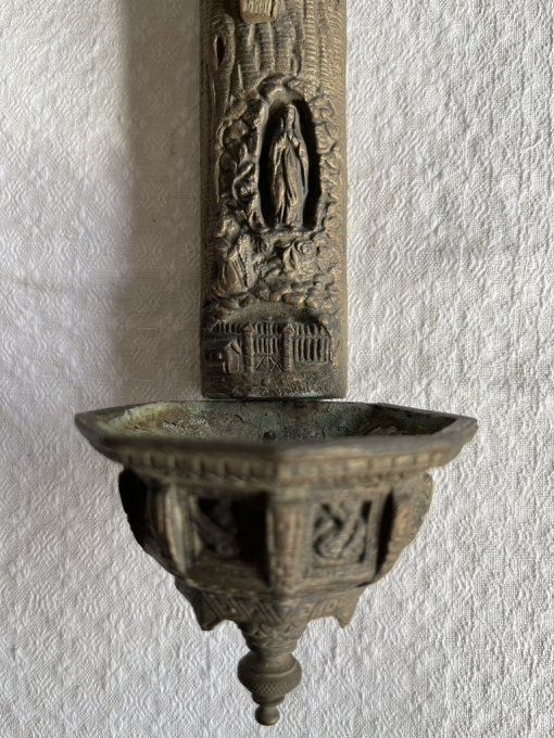 Bénitier visé dans le bas de la croix, on peut voir du vert de gris à l'intérieur.