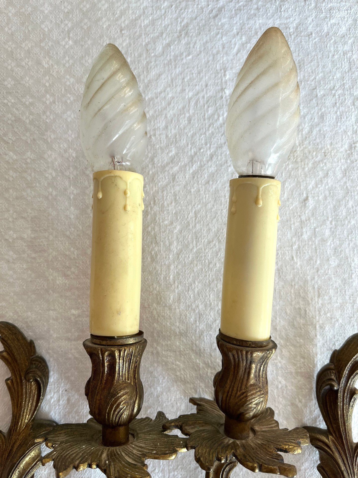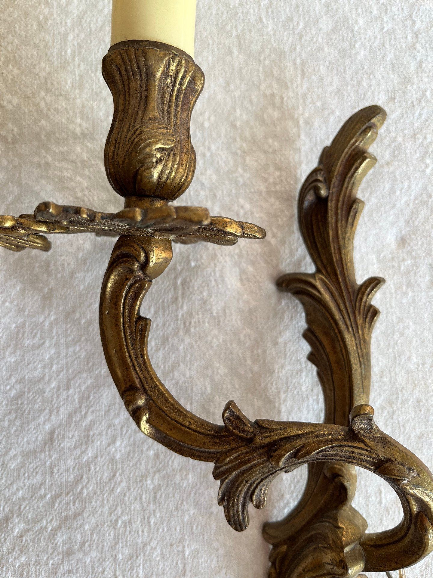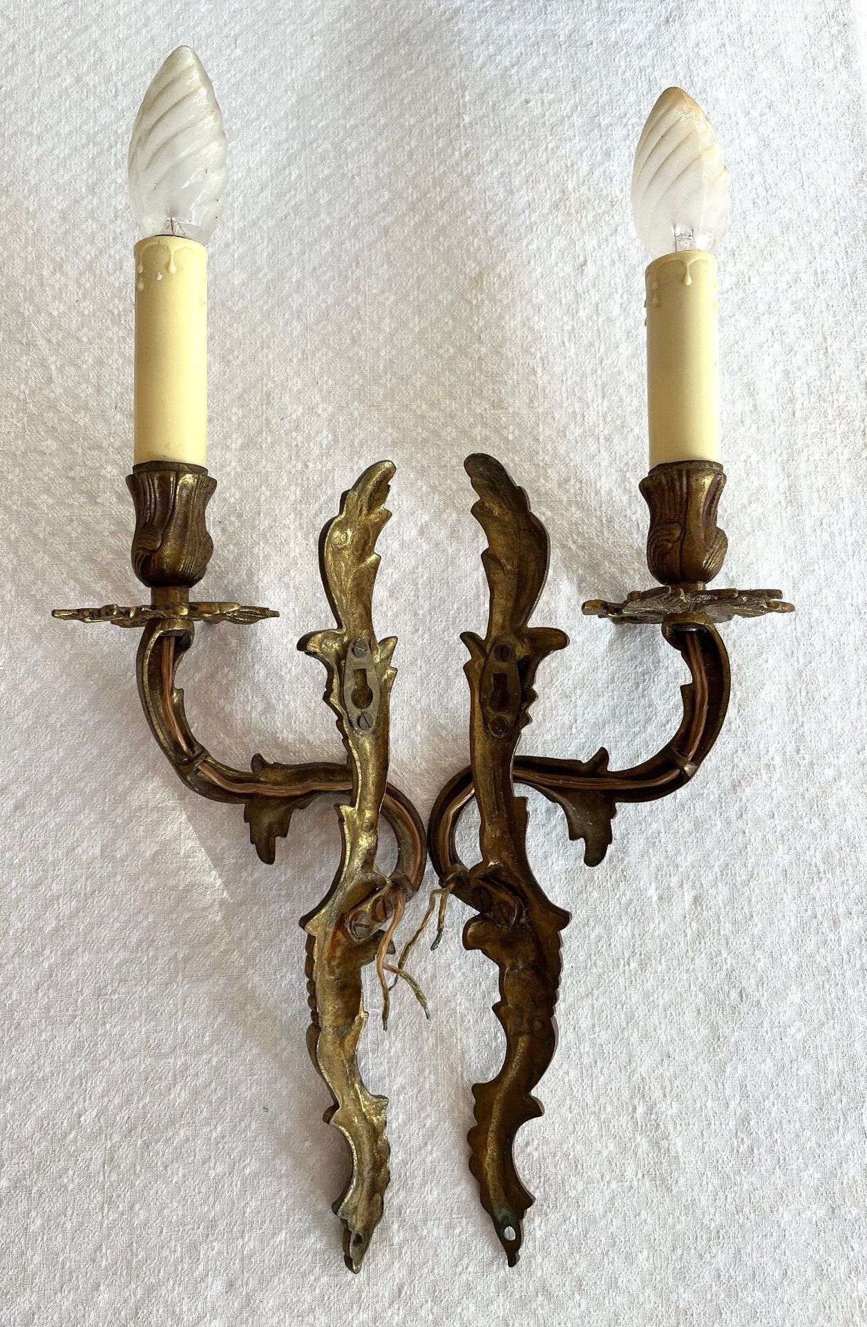 Superbe paire d'appliques murales décoratives, conçues pour imiter des bougeoirs ou candélabres muraux. Ces pièces ajouteront une touche d'élégance classique et de lumière tamisée dans un couloir, un salon ou une chambre. Voir description
