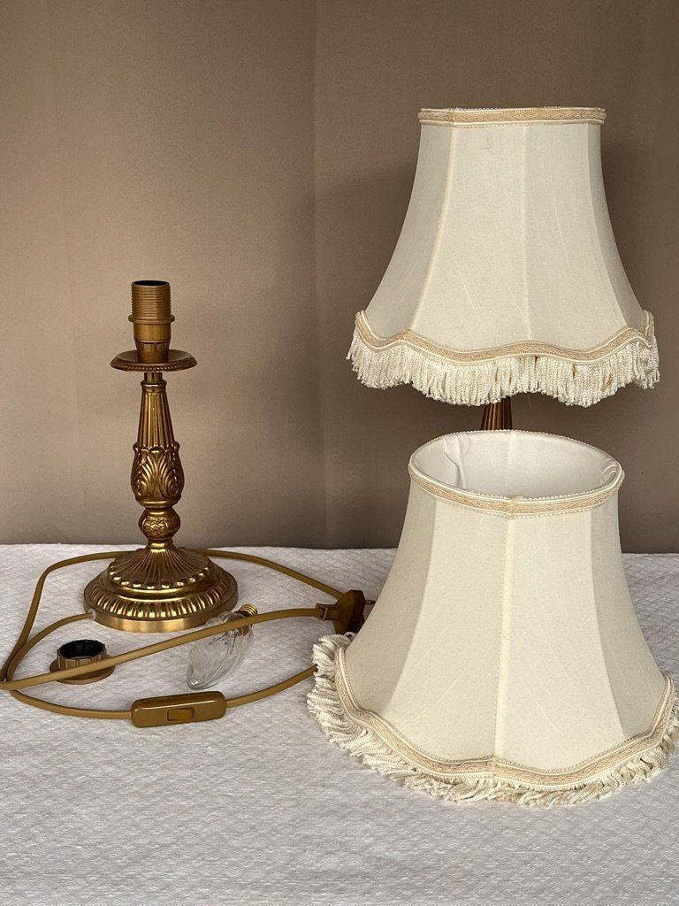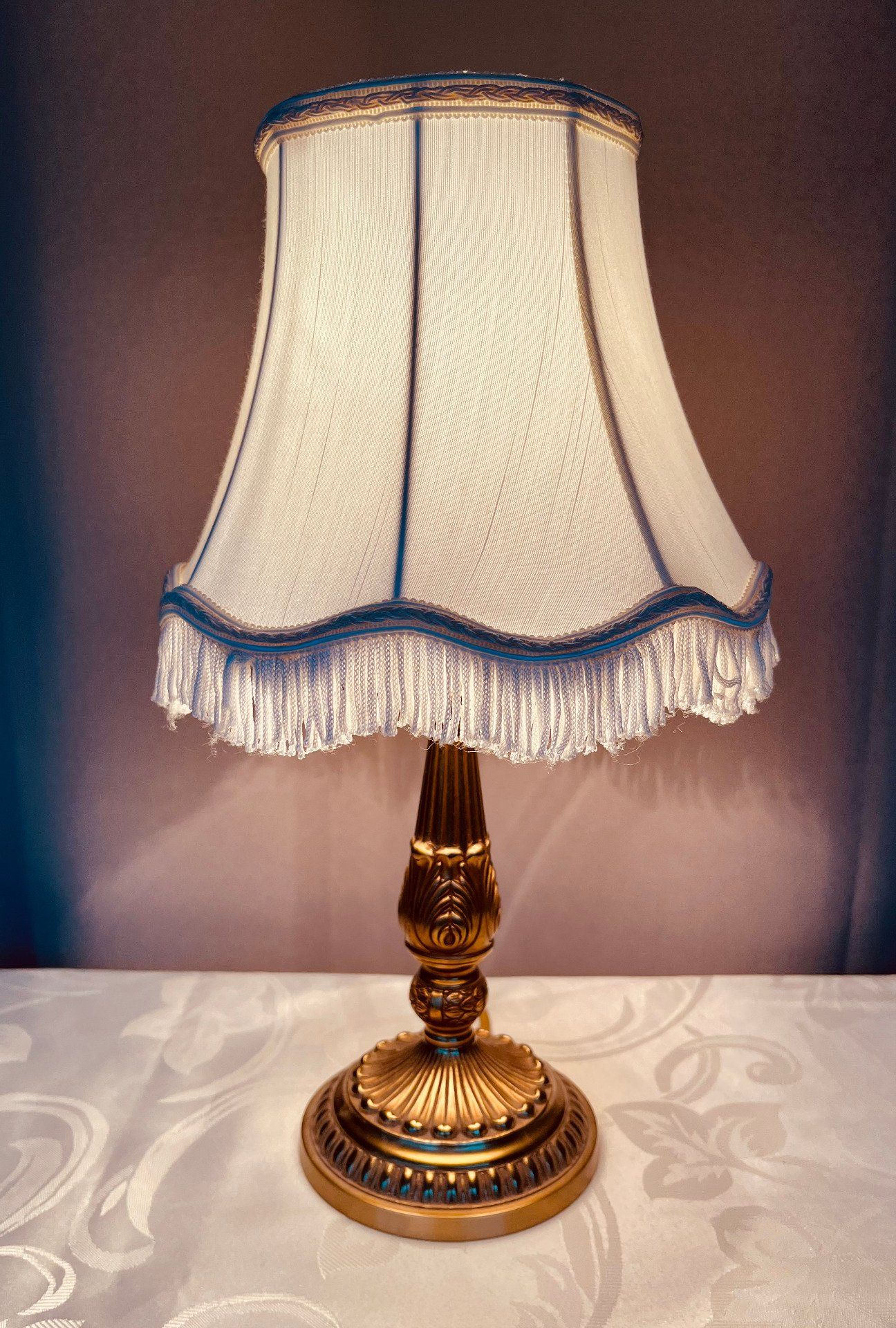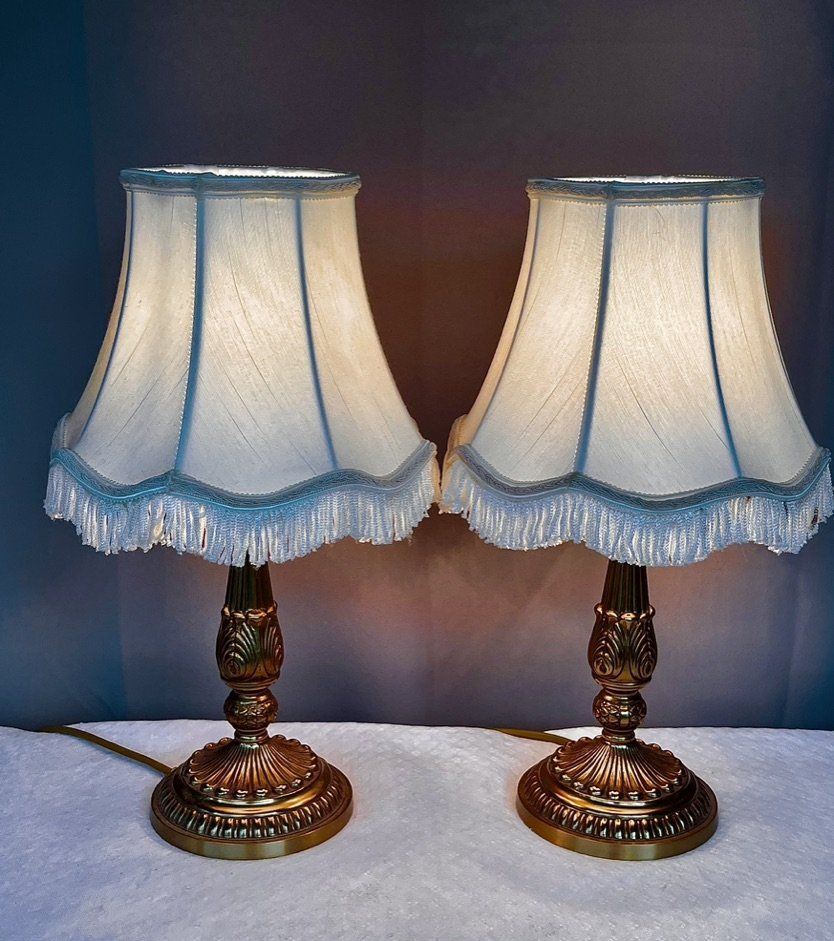 Les abat-jours de couleur crème sont ornés de galons délicats et de franges blanches, typiques du style boudoir chic.