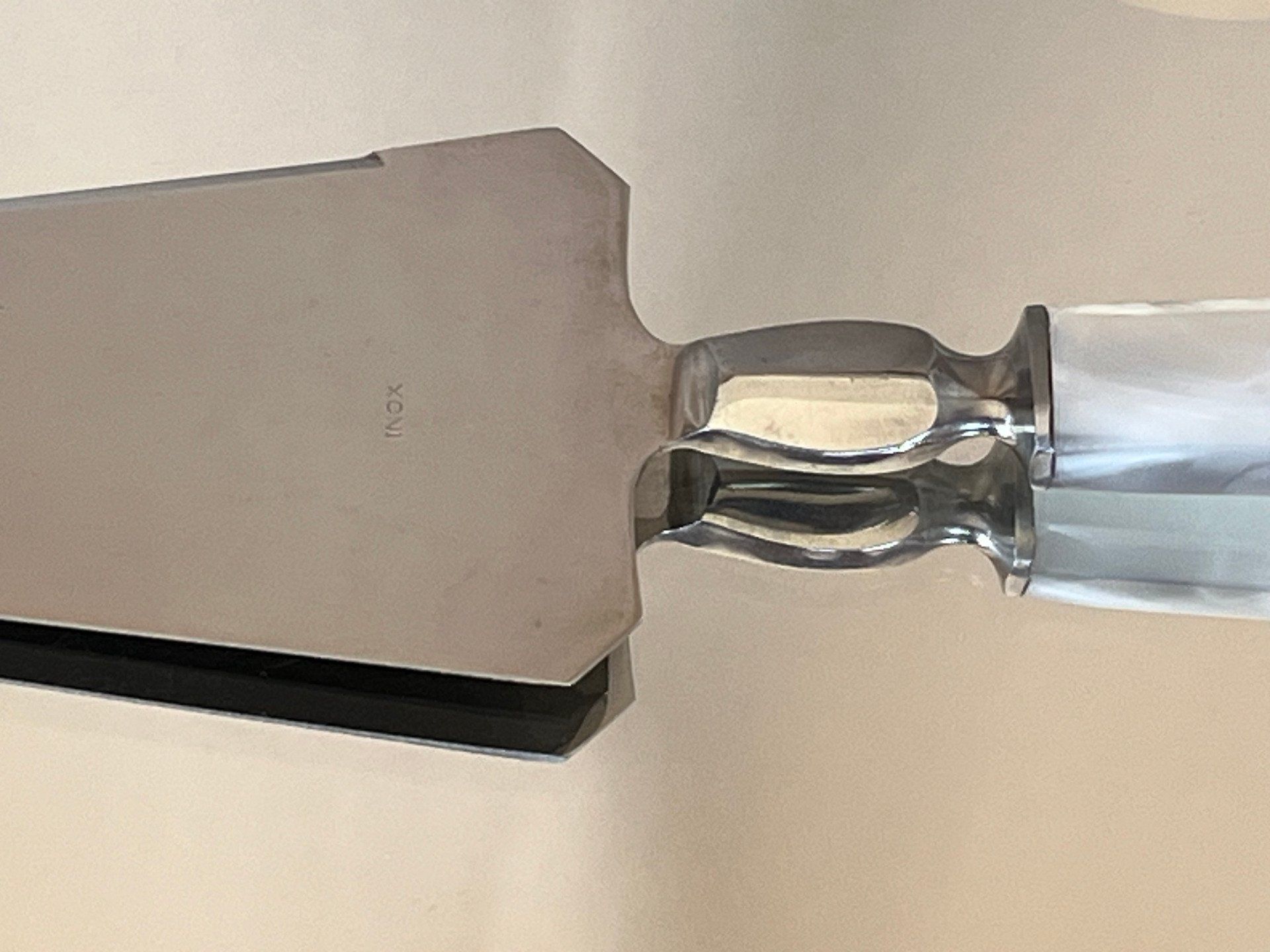 Cette pelle à tarte allie la robustesse de l'acier inoxydable à l'élégance d'un manche travaillé en imitation nacre, offrant de jolis reflets.
