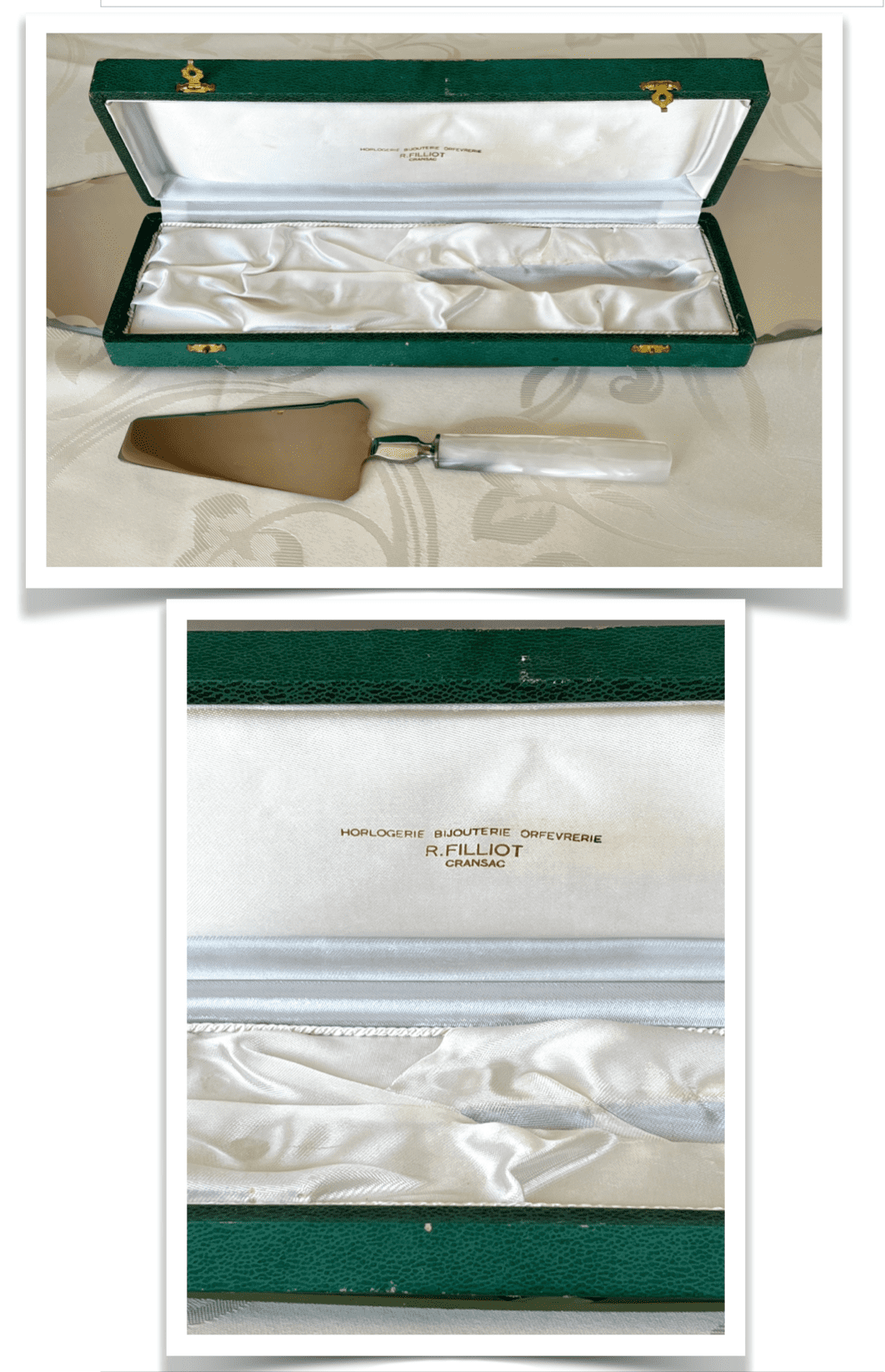 Belle pièce d'orfèvrerie régionale. R. Filliot à Cransac (Aveyron) était une maison réputée pour ses arts de la table de qualité. Ce type de pelle à tarte avec manche en imitation nacre (souvent en plexiglas ou résine travaillée) est très emblématique des services de réception des années 50-60.