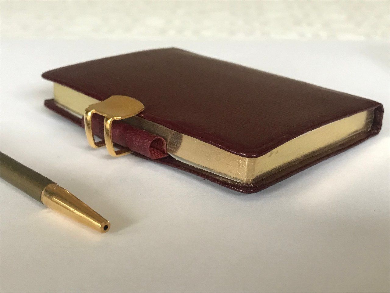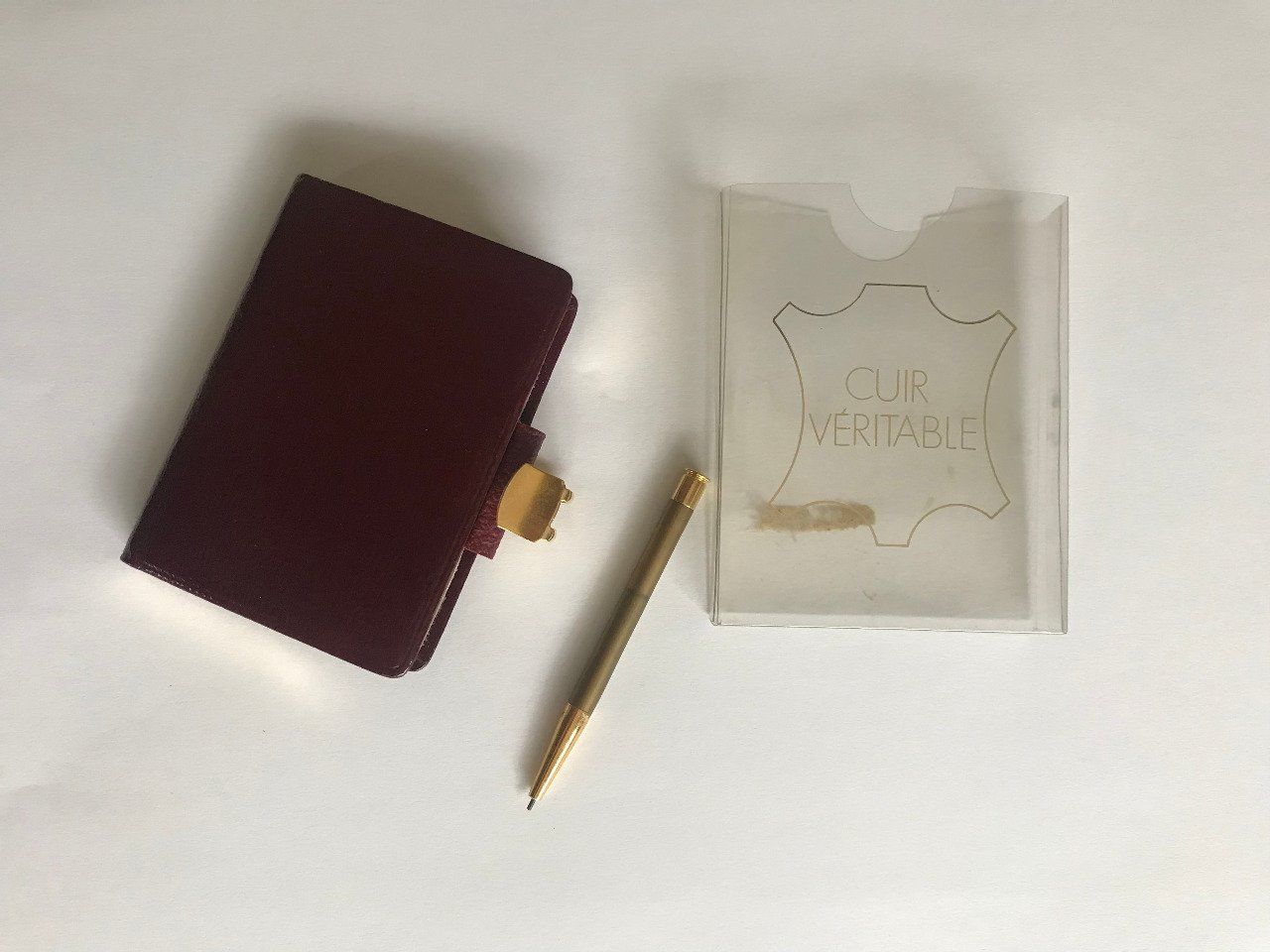 Bel agenda avec sa couverture en cuir bordeaux, ses dorures sur les tranches, accompagné de son petit crayon à papier.