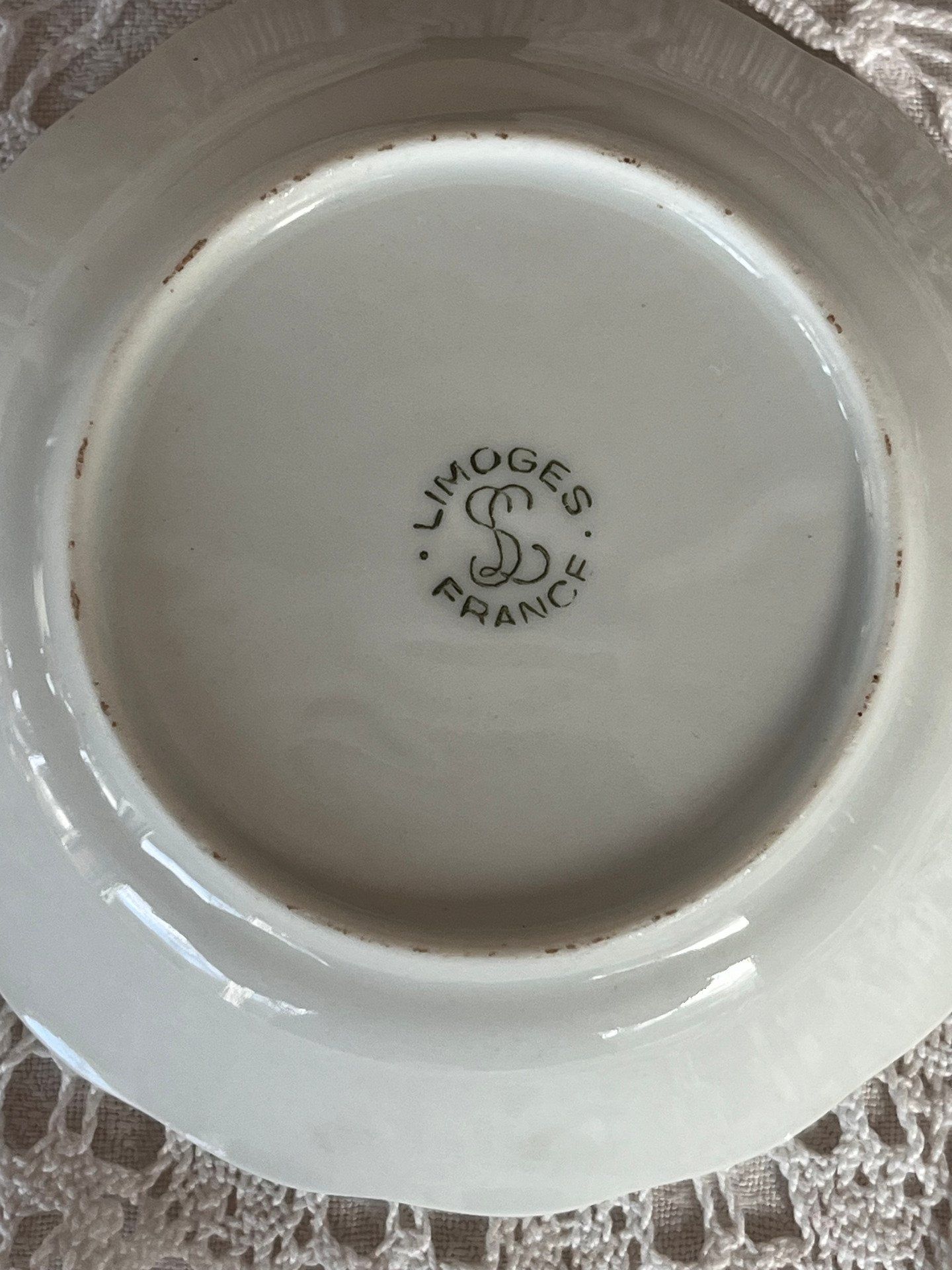 Mesurant 10 cm de diamètre et 2 cm de hauteur, elle est estampillée "Limoges France" au revers avec un monogramme stylisé.