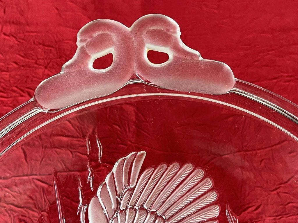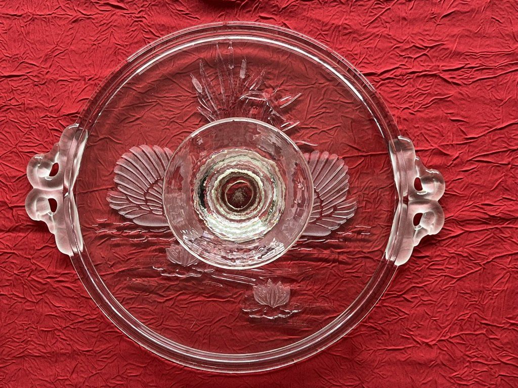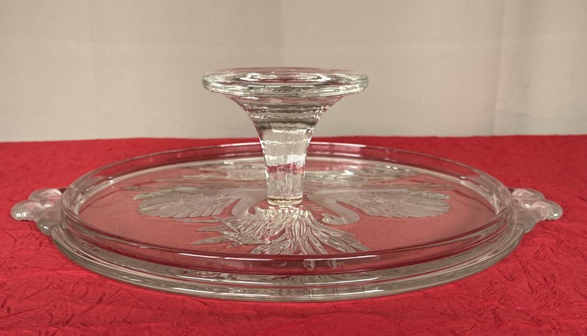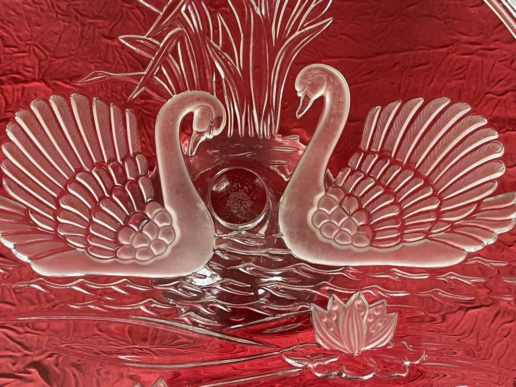 Plat à tarte sur pied central Walter Glass en cristal pressé-moulé décor cygnes et nénuphars. Travail en relief sous le plateau lisse, poignées cygnes en verre dépoli. Pièce de service vintage élégante pour vos tables ou en décoration. Voir description.