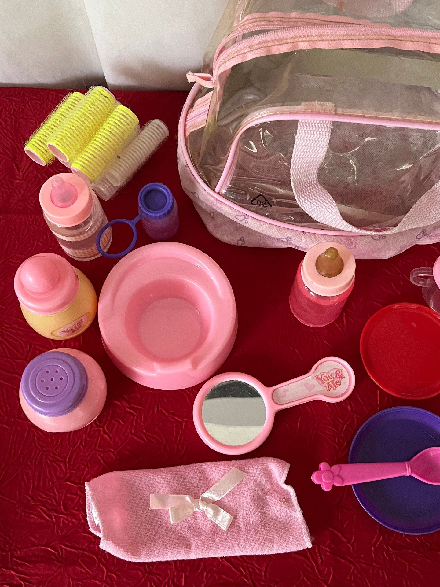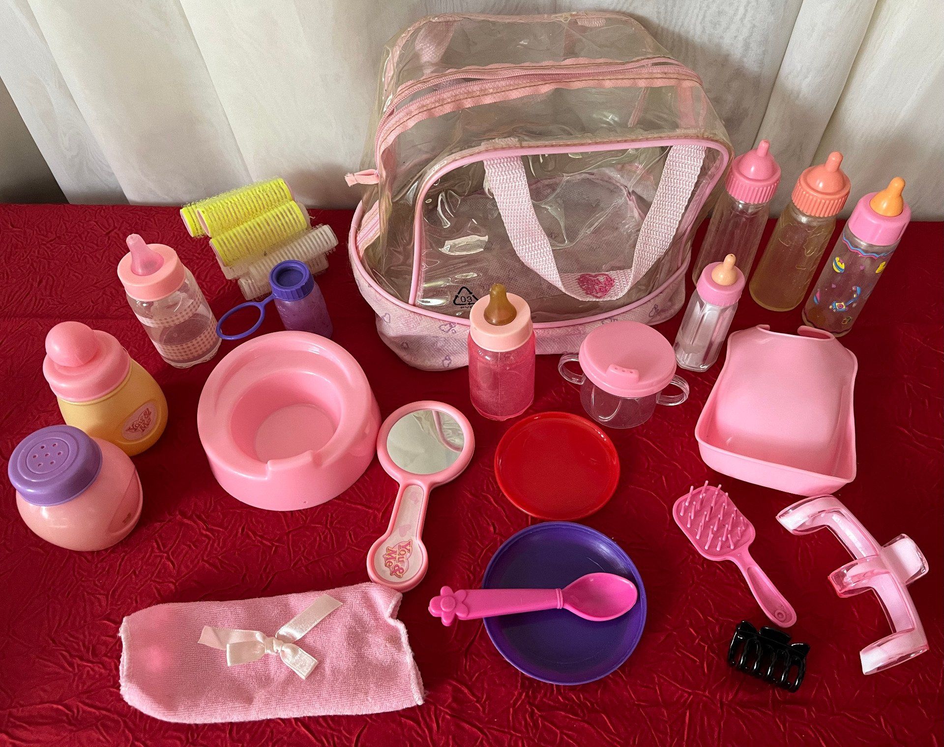 Pochette, idéale pour le transport, contient tout le nécessaire pour prendre soin d'un bébé, d'une poupée :