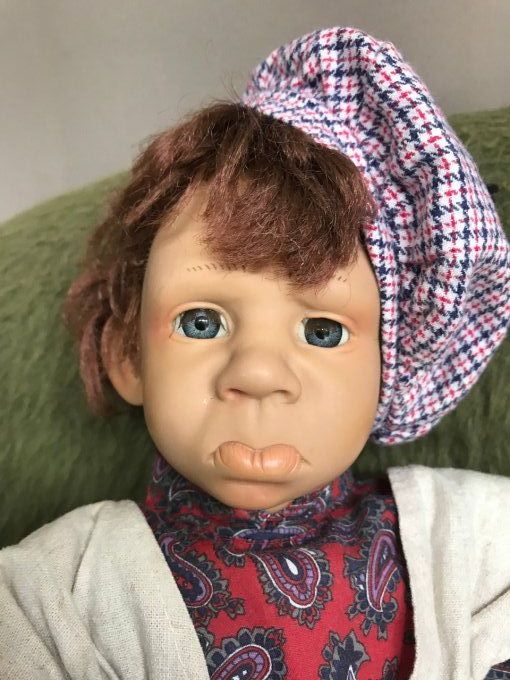Poupon garçon à l'expression triste visage boudeur, très réel ! Avec sa tenue d'origine. Jouet de la marque Simba, noté dans la nuque. Cette poupée des années 90 a la tête, les bras et les jambes en vinyle dur avec corps souple en tissu. Voir description